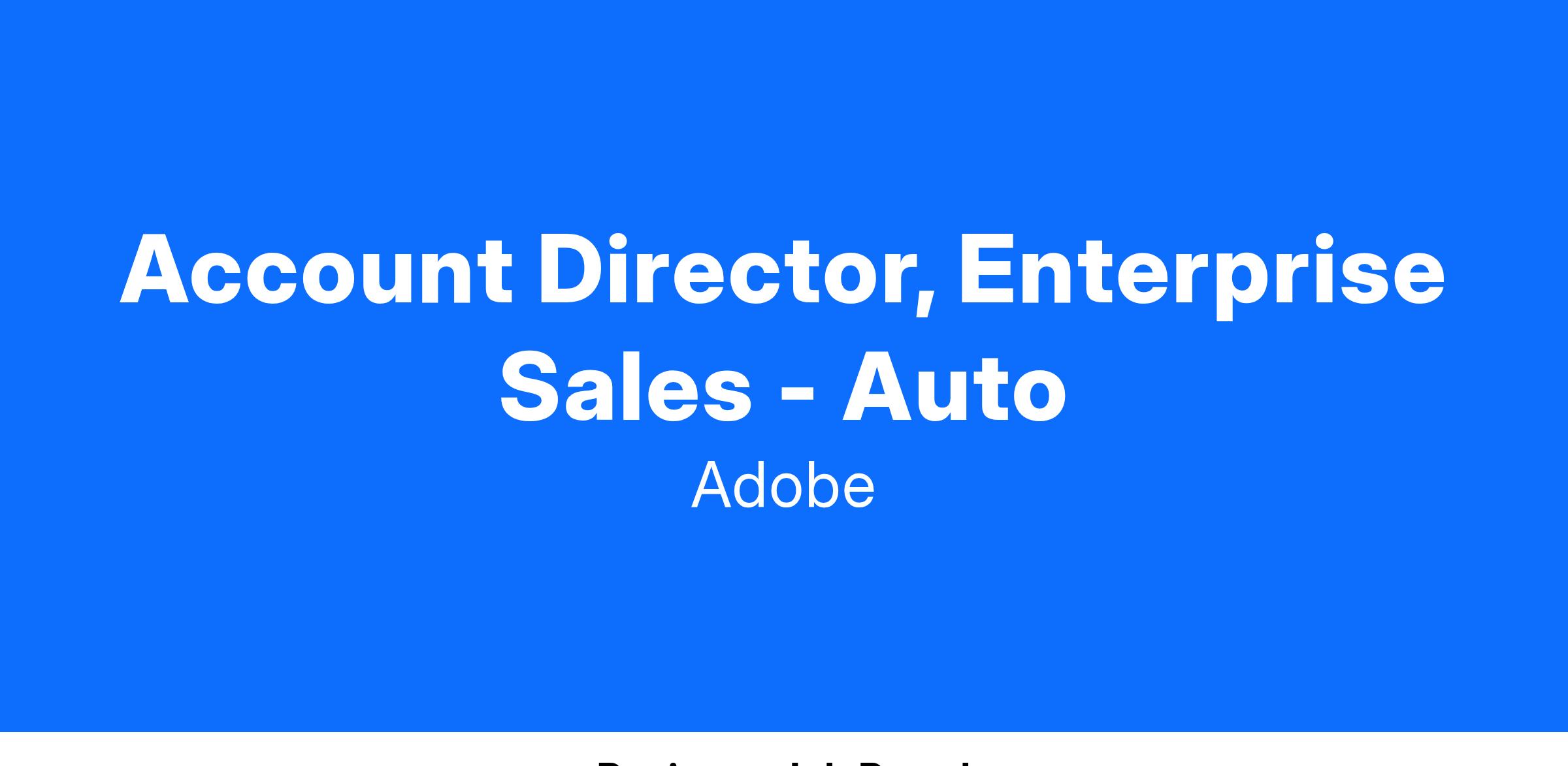 Adobe is looking for an Account Director who is responsible for achieving sales targets through the sale of Adobe’s Digital Marketing product lines. As a part of our enterprise sales team, working with Adobe’s largest customers across the manufacturing industry. This includes the development of long-term relationships with customers as well as crafting strategic account plans. The Account Director will achieve this through software solution selling capabilities and direct, face-to-face contact with the customer. Responsibilities include building relationships at all levels with a focus on c-suite, and effectively navigating the customer's organization. You will guide and assist customers in achieving a successful start with Adobe and help them expand the value realized from our solution. This is a key role at one of the most respected technology companies in Silicon Valley – and the entire US. Successful candidates will be high energy, data-minded, naturally inquisitive, and tech-savvy individual with prior senior level sales experience. Do you value extraordinary benefits, and one of the best places to work in the world?