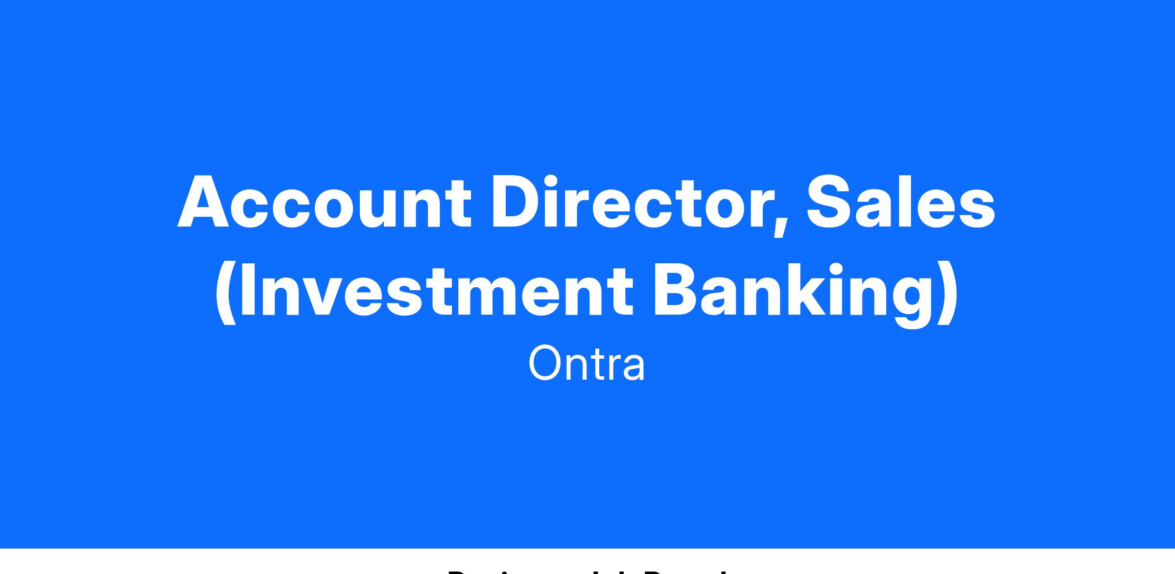 Ontra is seeking an Account Director, Investment Banking, reporting to our Managing Director of New Sales, to join our growing Sales team.