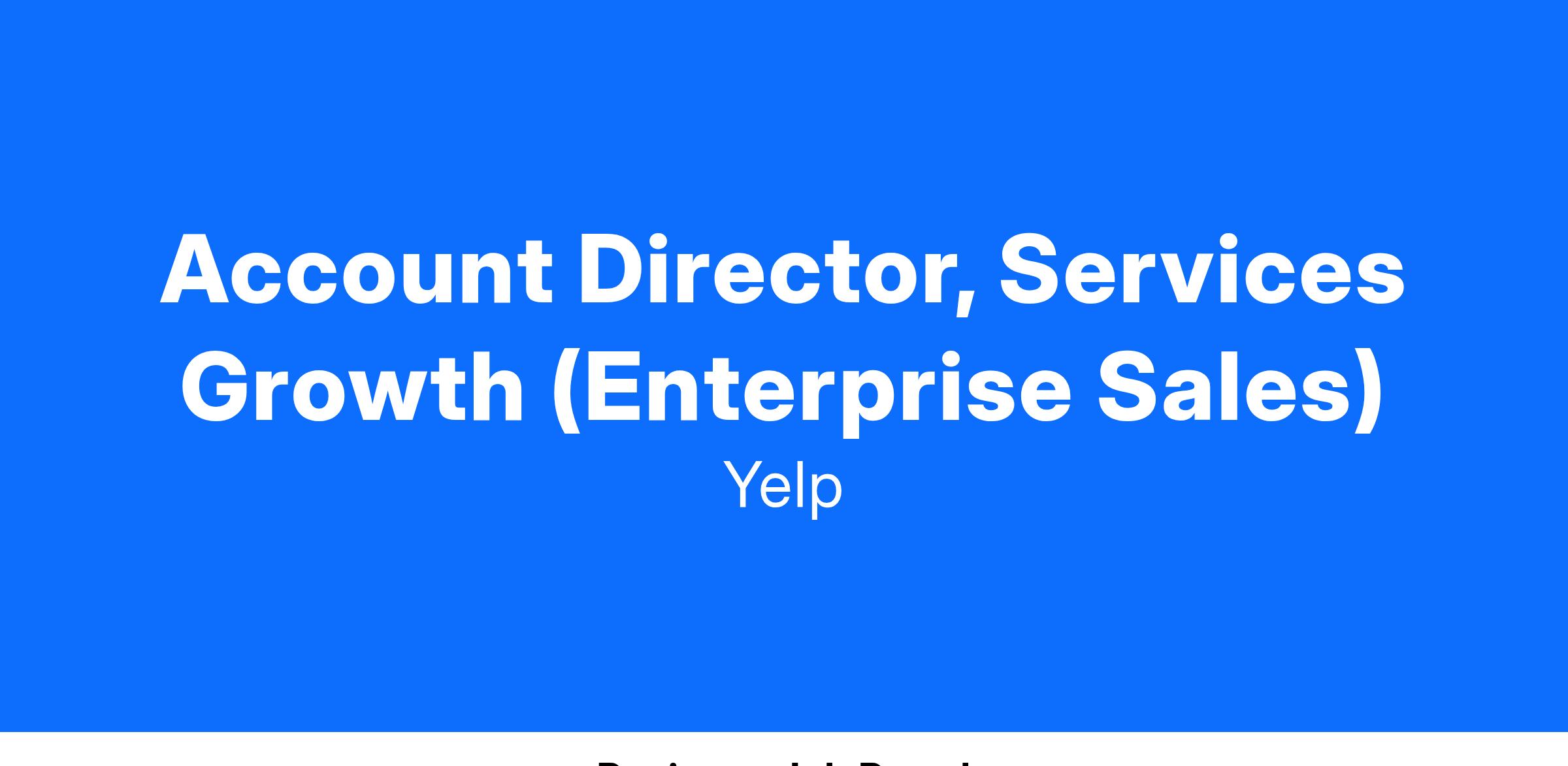 Summary **Please note that while this is a remote position, it is required that the candidate resides within 50 miles of a major airport.** Yelp’s mission is to connect people with great local businesses. Yelp’s Enterprise team partners with National businesses to provide industry leading digital advertising solutions. Yelp’s Services offering, inclusive of our Request A Quote (RAQ) product, delivers strong ROI by driving leads to businesses. The Director, Services Growth role is the face of Yelp’s Services business within the Enterprise team, and supports our revenue growth with our largest clients and prospective customers. This is a client-facing role where you will be a key influencer in the sales cycle, partnering with sales reps and leadership to be the authority of Services offerings (including RAQ) during meetings. Through your client engagement, you will be instrumental in defining and improving our go-to-market strategy, while working cross functionally to execute on our growth goals. You are an expert in the Services digital advertising ecosystem, possessing knowledge of all digital advertising models and major platforms. You serve as a thought leader within the business and are curious, driven, creative, and hungry to build something big at Yelp. #LI-Remote What you'll do: You will support organization revenue goals by joining client calls to demonstrate platform capabilities, sell in the value and help overcome client objections You will lead the development of our Enterprise Services playbook, clearly outlining the platform’s best sales practices, improving our sales efficiency in partnership with Sales leadership, Sales Enablement and Customer Success You will provide regular reporting on the state of the business, analyzing trends and sharing insights with leadership to improve our sales strategy and product You will serve as the sales subject-matter expert on the Services verticals & RAQ product and our process You will represent Services vertical within Enterprise sales as a key liaison in coordinating with other internal functions (e.g. Product, BizDev, Finance, Marketing, etc.) You will assist Sales and Product Marketing in pitching new partnerships and features You will provide ongoing feedback to the Product Management team to improve capabilities and offerings You will provide executive leadership recommendations across the digital landscape, rooted in revenue growth supported by data driven insights Working through creative solutions to help Services customers adapt their existing operational execution such that it supports Yelp’s offering (including, but not limited to: Leads API and CAPI adoption) What it takes to succeed: You have a BA/BS degree or similar college level education You have 10+ years in digital advertising sales and 5+ years extensive experience within the Services vertical You have knowledge of the Services vertical including areas such as lead generation, lead management & qualification, and measurement/attribution You have excellent analytical, data driven strategy and project management skills You have strong attention to detail, process optimization orientation and problem-solving skills You have the ability to work with and respectfully influence all levels of the organization You are a motivated go-getter with a high capacity to multitask and prioritize You are able to navigate uncertainty successfully for all parties and lead to desired outcomes You believe in Yelp’s mission and naturally put the company and team first You play well with others, you treat others with respect, bring a positive attitude to the table and value diversity in viewpoints You are ready and willing to roll up your sleeves and build something big at Yelp What you'll get: Base salary is $165,000 plus performance based incentives Effective your first day: Full medical, vision, and dental coverage Mental health support and services via Modern Health 15 days PTO (accrual begins on date of hire and increases with 2+ years of tenure thereafter), 7 paid wellness days, 12 paid holidays, plus one floating holiday Up to 14 weeks of parental leave Monthly wellness subsidy Flexible spending account 401(k) retirement savings plan Employee stock purchase plan Professional development reimbursement Work from home reimbursement Closing At Yelp, we believe that diversity is an expression of all the unique characteristics that make us human: race, age, sexual orientation, gender identity, religion, disability, and education — and those are just a few. We recognize that diverse backgrounds and perspectives strengthen our teams and our product. The foundation of our diversity efforts are closely tied to our core values, which include “Playing Well With Others” and “Authenticity.” We’re proud to be an equal opportunity employer and consider qualified applicants without regard to race, color, religion, sex, national origin, ancestry, age, genetic information, sexual orientation, gender identity, marital or family status, veteran status, medical condition or disability. Actual salary offered may vary based on multiple factors, including but not limited to, an individual's location and experience. We will consider for employment qualified candidates with arrest and conviction records, consistent with applicable law (including, for example, the San Francisco Fair Chance Ordinance for roles based in San Francisco, the Los Angeles County Fair Chance Ordinance for roles based in the unincorporated areas of Los Angeles County, and the California Fair Chance Act for roles based in California). We are committed to providing reasonable accommodations for individuals with disabilities in our job application process. If you need assistance or an accommodation due to a disability, you may contact us at accommodations-recruiting@yelp.com or 415-969-8488. Note: Yelp does not accept agency resumes. Please do not forward resumes to any recruiting alias or employee. Yelp is not 