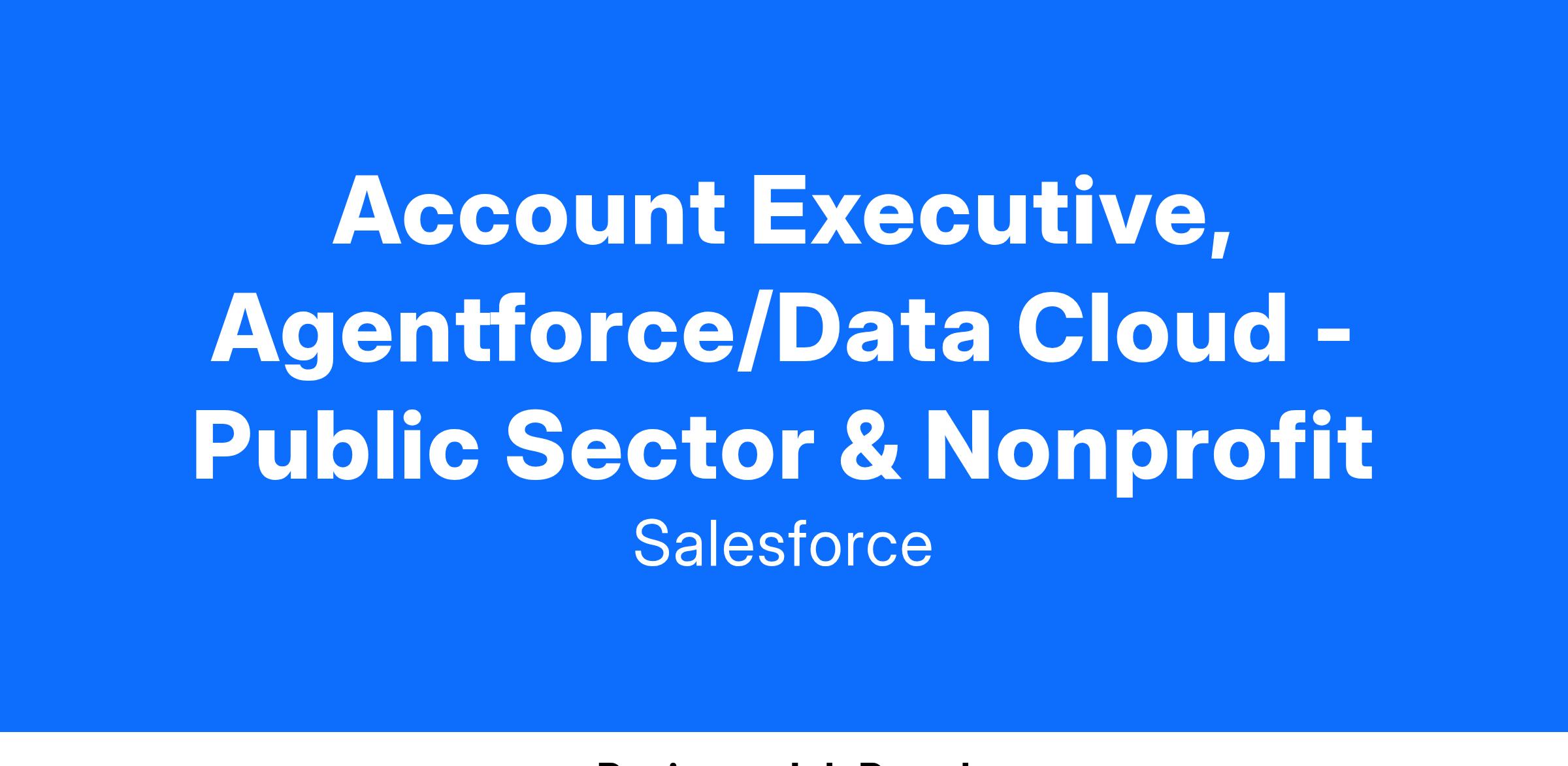 At Salesforce, we're seeking outstanding individuals to join our team as Account Executives with a strong technical background and expertise in AI-driven solutions. In this role, you will be pivotal in driving revenue growth and encouraging enduring client relationships and applying innovative technology redefines customer engagement specifically for our Public Sector and/or Nonprofit clients.