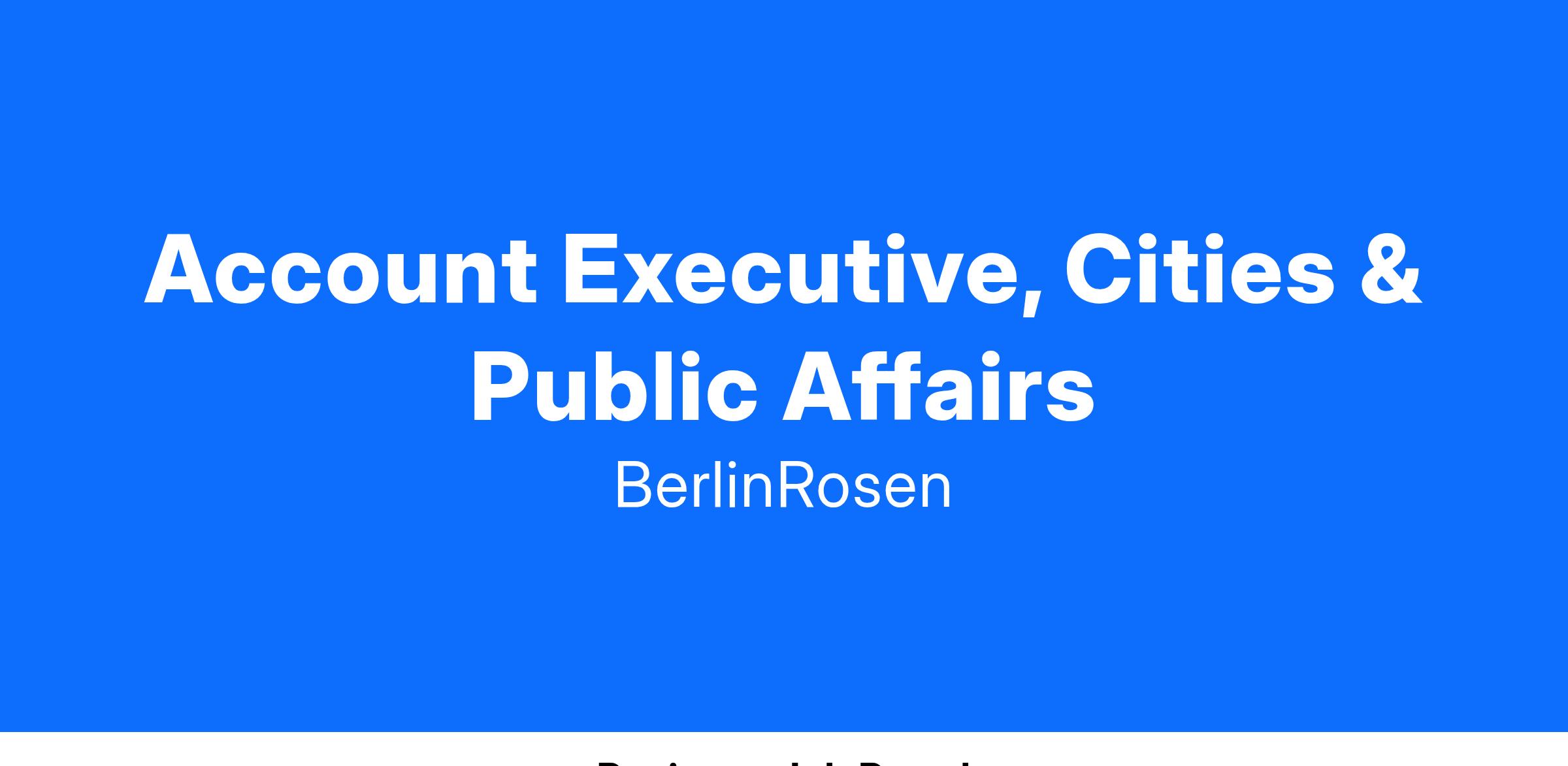 BerlinRosen is seeking an Account Executive to join our team working on public affairs. You will help lead daily client relations, plan and execute day-to-day project deliverables, support and lead junior staff, and conceptualize integrated strategies, pitches and media placements. You will also work closely with client leads and internal staff and develop and advance strategy with senior leaders. This is an exciting opportunity for someone passionate about issues that cities face, both in New York and across the country—including land use and urban planning, social issues, housing, sustainability, economic development and health care.
