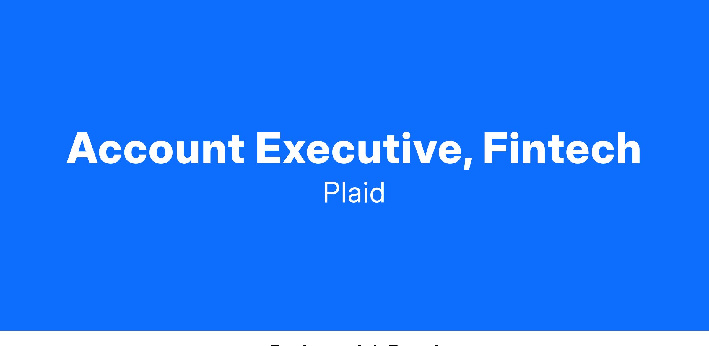 Your focus will be on working with Plaid's existing Fintech customers, deeply understanding their business, and aligning our solutions to help them achieve both near and long-term goals. You'll also be tasked with engaging Fintechs that don't currently work with Plaid, identifying opportunities to partner, and owning the end-to-end sales process.