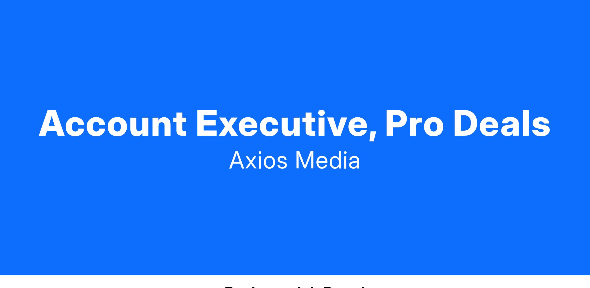 The big picture: Axios is a media company dedicated to providing trustworthy, award-winning content in an audience-first format. We are looking for a creative and collaborative sales professional to help lead new business growth for Axios Pro Deals.