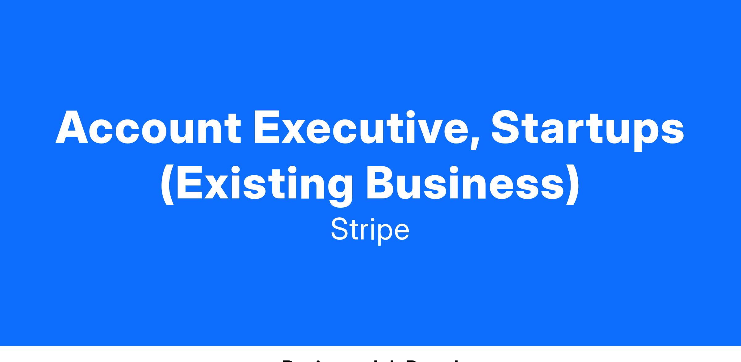 The Account Executive, Existing Business team is a highly consultative sales team that is responsible for the growth and retention of Stripe’s largest and fastest growing Startups SMB customers. As an Account Executive, Existing Business team member, you’ll identify new opportunities for our clients to get the most out of Stripe by quickly understanding our clients’ needs, execute scaled sales strategies to close upsell and renewals with existing Stripe customers, and drive end-to-end campaigns to increase adoption of Stripe’s offerings.