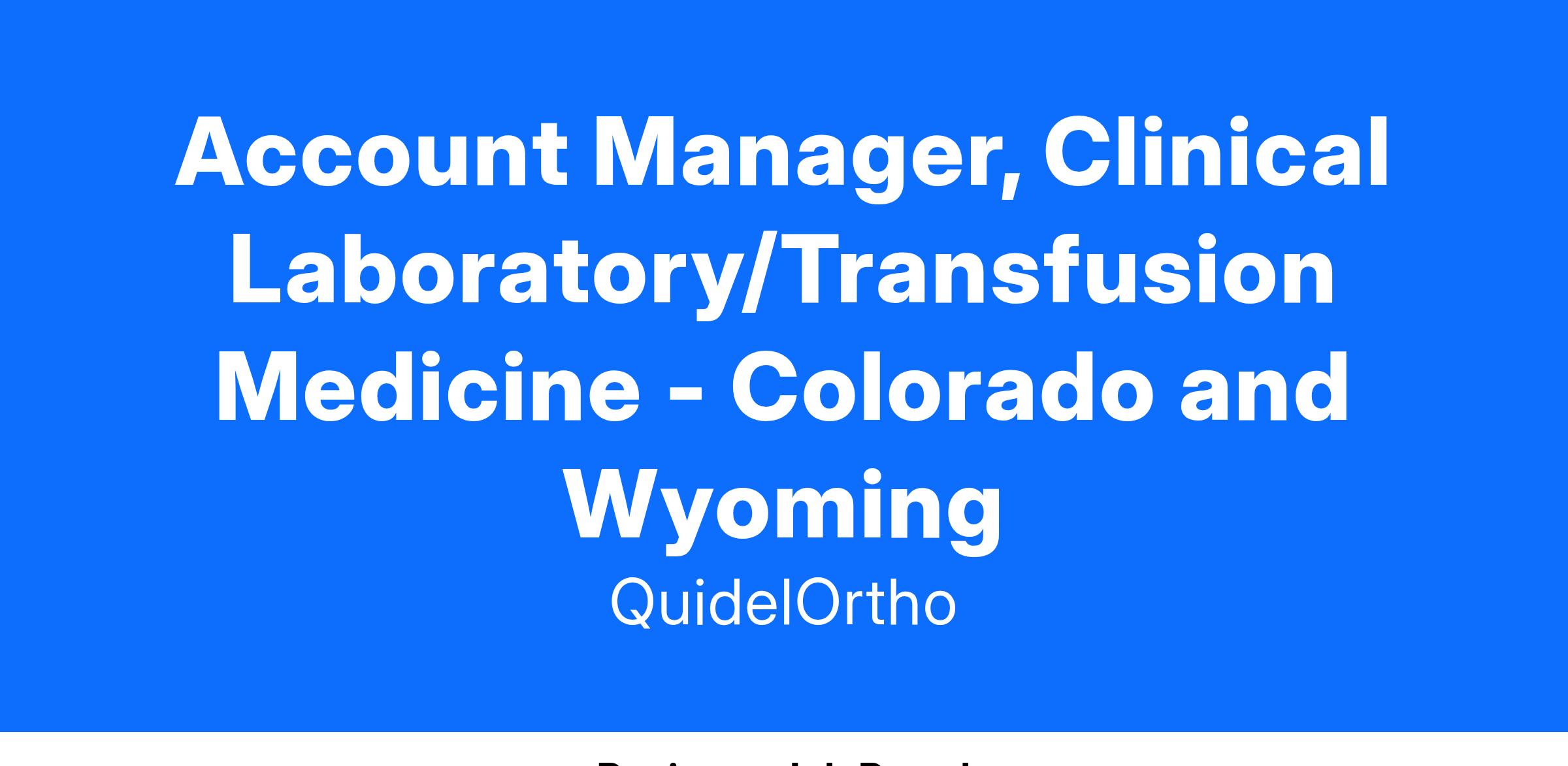 As we continue to grow as QuidelOrtho, we are seeking an Account Manager, Clinical Laboratory/Transfusion Medicine in Colorado and Wyoming. The Account Manager, CL/TM is a front-line, customer-facing, quota-carrying role responsible for driving sales and growth of QuidelOrtho’s Clinical Laboratory (CL) and Transfusion Medicine (TM) product lines. This role manages a geographic territory or a portfolio of named accounts, serving as the primary point of contact for customers. Key responsibilities include achieving instrument sales targets, growing assay and reagent utilization, and ensuring customer retention. The role requires a consultative, value-driven sales approach, supported by collaboration with cross-functional teams to deliver tailored solutions that meet customer needs. Success in this position is measured by the ability to meet territory revenue and profitability goals while delivering a best-in-class customer experience. This is a field based position supporting and located in Colorado or Wyoming.
