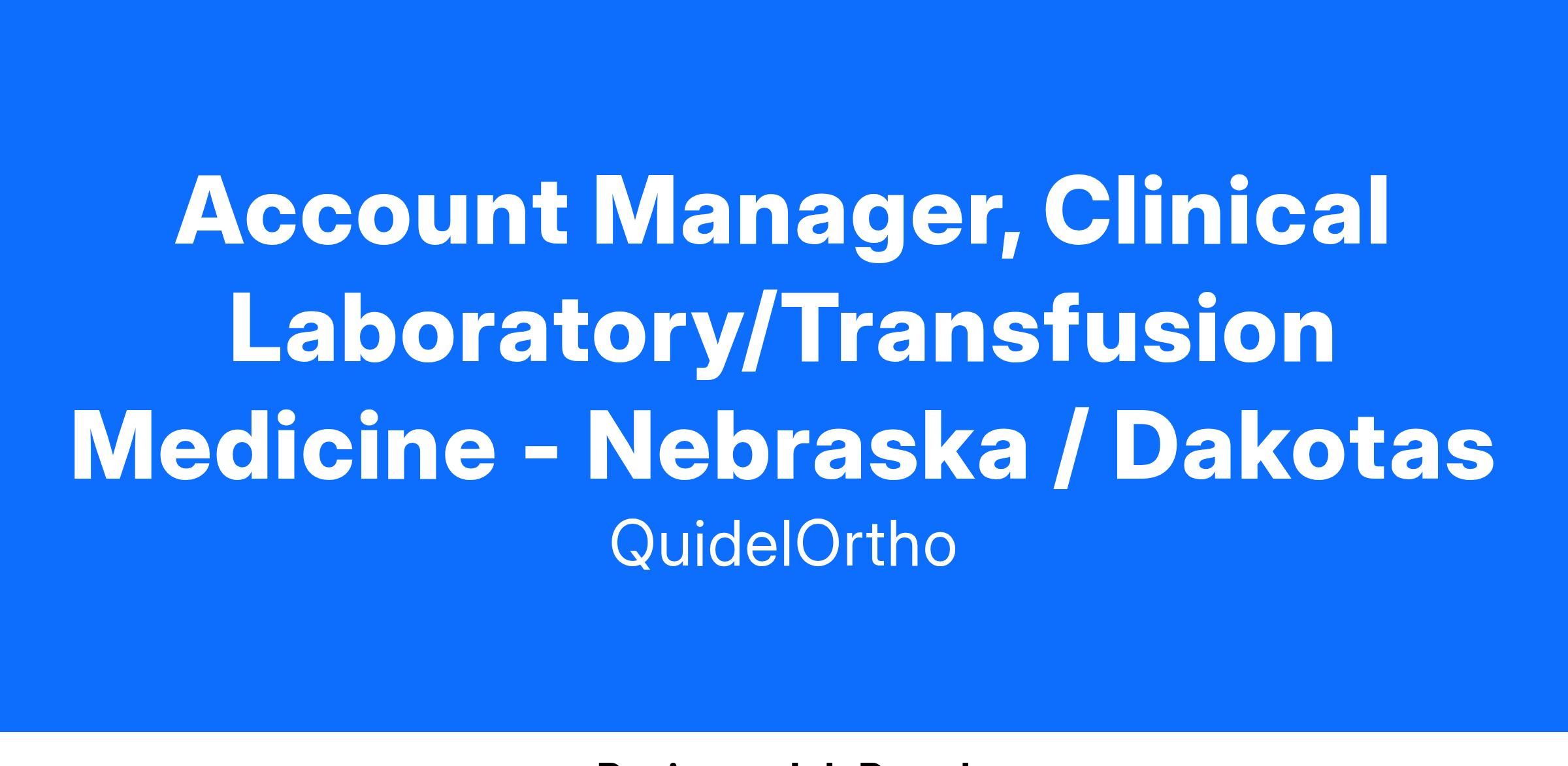As we continue to grow as QuidelOrtho, we are seeking an Account Manager, Clinical Laboratory/Transfusion Medicine in Nebraska or Dakota's . The Account Manager, CL/TM is a front-line, customer-facing, quota-carrying role responsible for driving sales and growth of QuidelOrtho’s Clinical Laboratory (CL) and Transfusion Medicine (TM) product lines. This role manages a geographic territory or a portfolio of named accounts, serving as the primary point of contact for customers. Key responsibilities include achieving instrument sales targets, growing assay and reagent utilization, and ensuring customer retention. The role requires a consultative, value-driven sales approach, supported by collaboration with cross-functional teams to deliver tailored solutions that meet customer needs. Success in this position is measured by the ability to meet territory revenue and profitability goals while delivering a best-in-class customer experience. This is a field based position supporting and located in Nebraska or Dakota's.