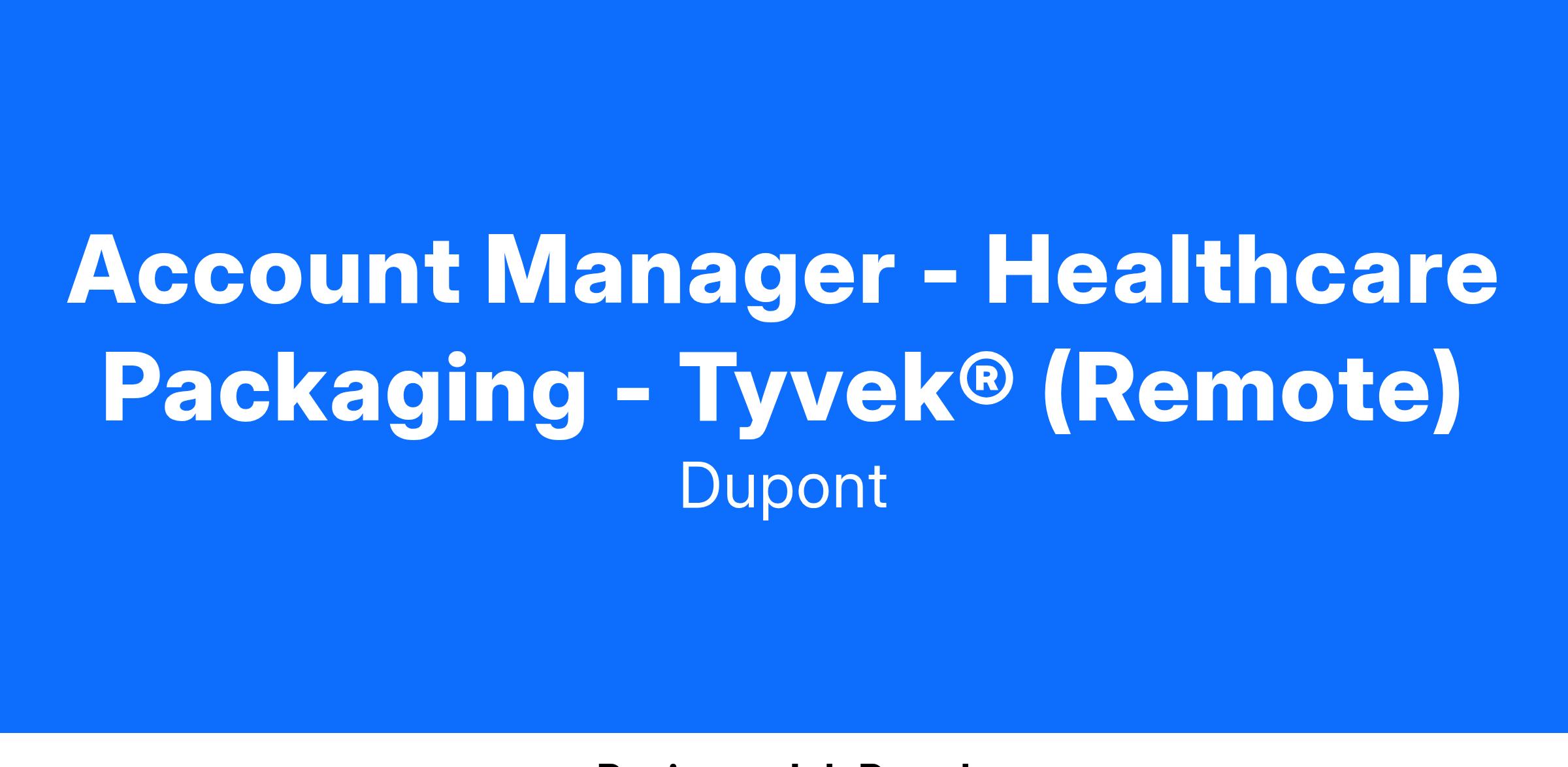 DuPont has an exciting and challenging opportunity for an Account Manager for Healthcare Packaging - Medical Device Manufacturer (MDM) & Pharmaceutical in the North America DuPont™ Tyvek® Healthcare Roll Goods segment. This role will maintain and expand relationships with strategic value chain partners, as well as other assigned accounts that serve the North America Healthcare Packaging market. This role is part of the Sales Organization. It is responsible for driving demand generation at the end-user level (MDMs and Pharmaceutical companies) and serves as a key facilitator during DuPont’s cross-functional engagements with key end-user accounts.