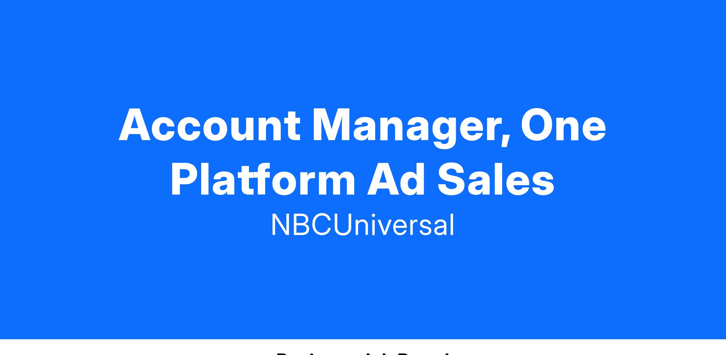 Work with the driven and highly motivated One Platform Ad Sales organization of NBCUniversal, one of the world’s leading media and entertainment companies. The Account Manager role is a strategic partner to Clients & Sales Account Executives.
