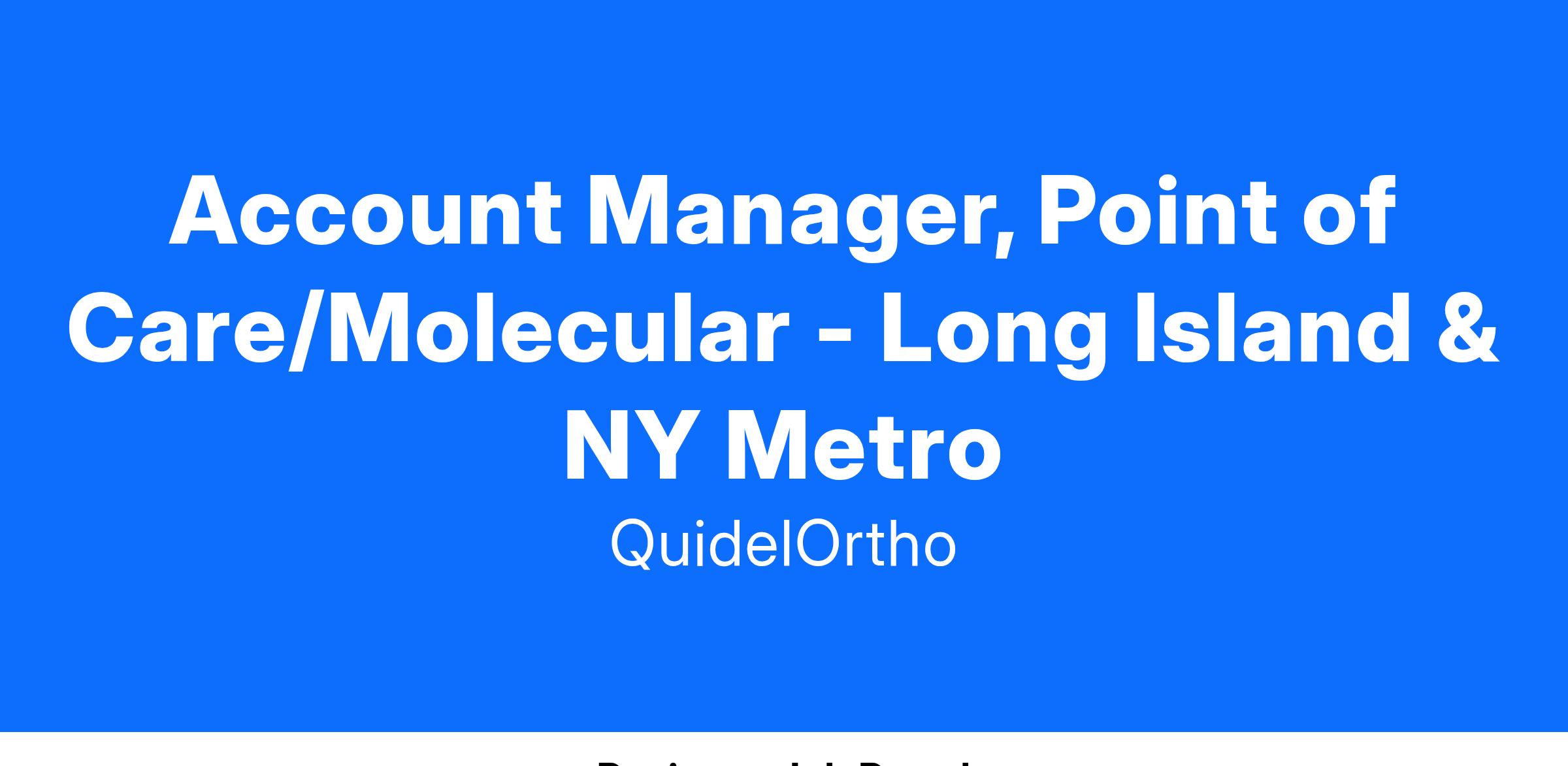 As we continue to grow as QuidelOrtho, we are seeking a Account Manager, Point of Care/Molecular in in Long Island, Queens, Brooklyn and Staten Island NY. The Account Manager, POC/MDx is a front-line, customer-facing, quota-carrying role responsible for driving sales and growth of QuidelOrtho Point of Care (POC) product lines including Sofia, Triage and Molecular (MDx). This role manages a geographic territory or a portfolio of named accounts, serving as the primary point of contact for customers. Key responsibilities include achieving instrument sales targets, growing assay and reagent utilization, and ensuring customer retention. The role requires a consultative, value-driven sales approach, supported by collaboration with cross-functional teams to deliver tailored solutions that meet customer needs. Success in this position is measured by the ability to meet territory revenue and profitability goals while delivering a best-in-class customer experience. This is a field-based sales position located in and supporting Long Island, Queens, Brooklyn and Staten Island NY territory.