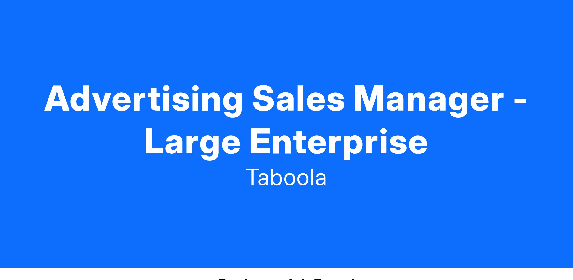 As an Enterprise Advertising Sales Manager you will join our growing NYC team and focus on building and managing long-term strategic partnerships with Tier 1 Brands and agencies across the East coast. As a highly-valued and proactive individual, you will contribute to Taboola’s growth by advocating the power of our platform within assigned client-direct and agency accounts. Success in this role is based on consistent prospecting/networking and pipeline development, new client acquisition/activation, client retention/growth, and achievement against progressive total revenue goals. We operate in a matrixed environment, with support from a skilled team of account managers, media planners, creative strategists and agency development leaders. Our culture and win-win approach to partnerships demand that a successful candidate will bring passion, accountability and a sense of professional urgency to work every day.