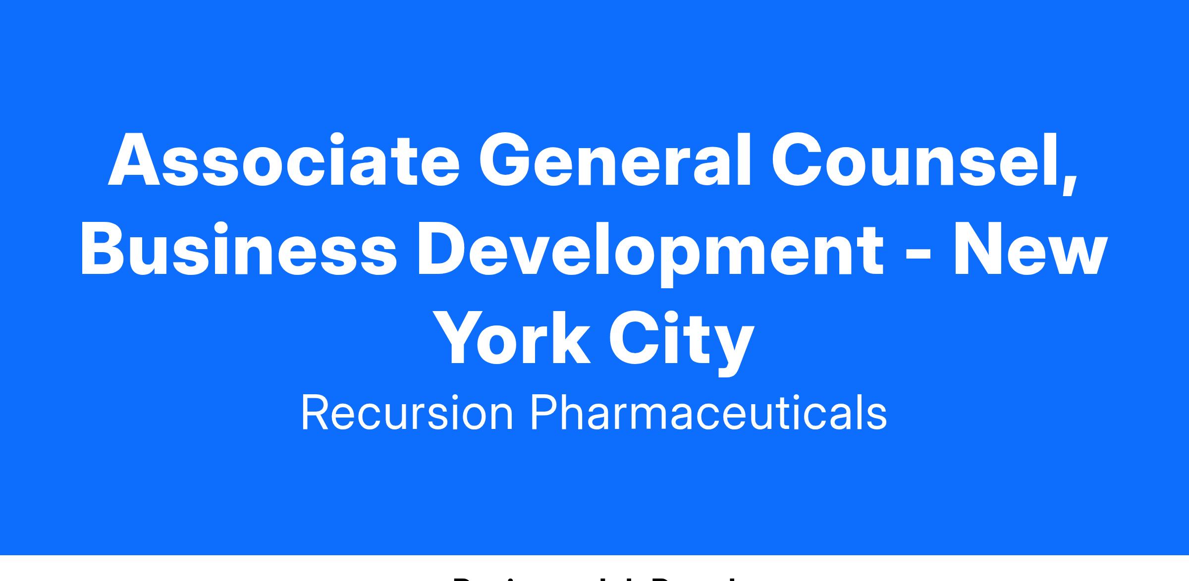 You will join a high-functioning team of expert lawyers, each working to advance the mission of Recursion. While the legal team members each have defined areas of expertise and support, they regularly connect to support each other in work and communication as well as professional development. Your role specifically will partner collaboratively with the Business Development team, which includes Alliance Management. Both groups operate at a fast-pace with open lines of communication and transparent strategic imperatives.