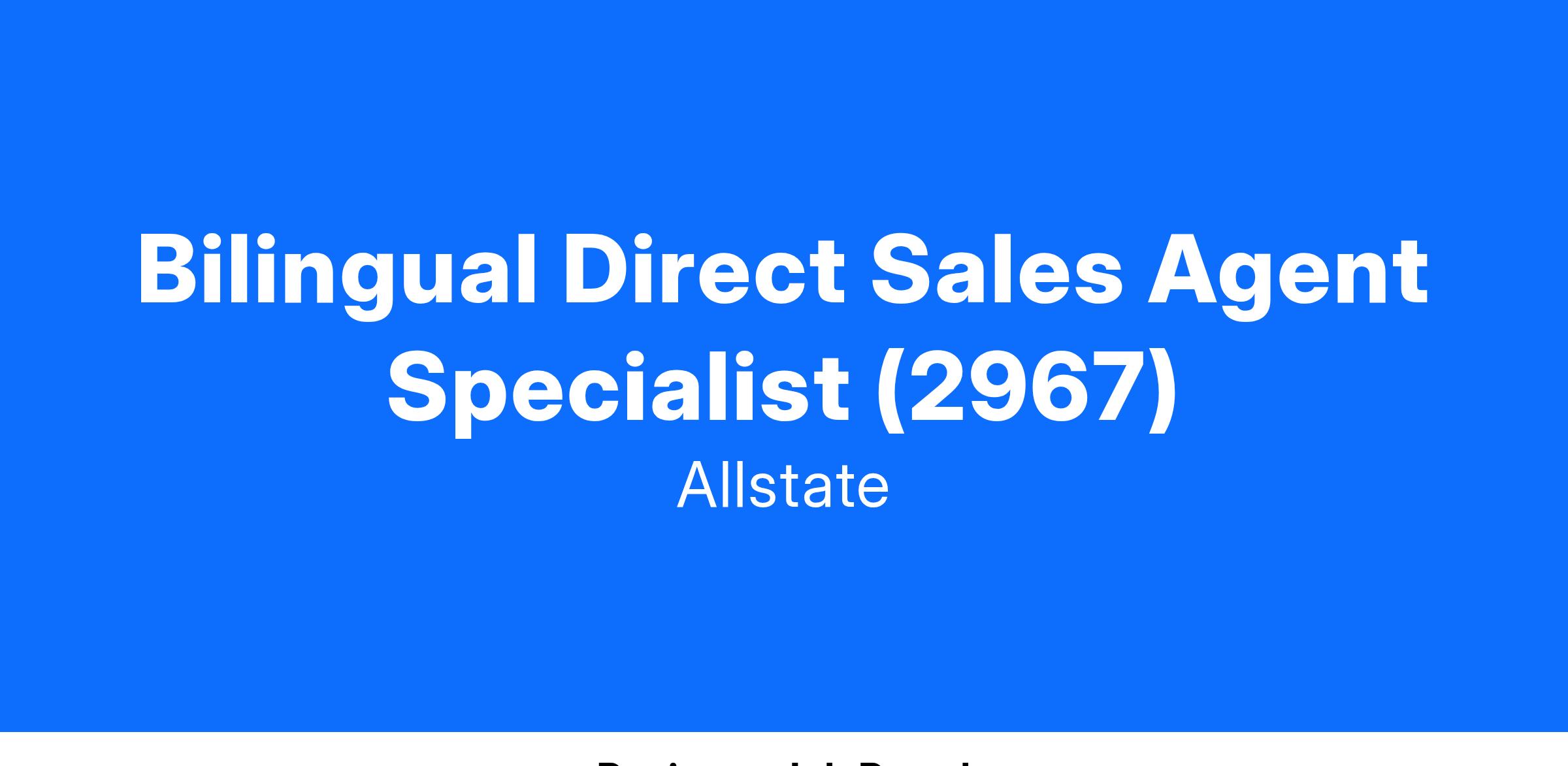 The Direct Sales Agent Specialist is responsible for the profitable growth and attainment of business goals by driving new business sales, and understanding customers’ needs to build rapport and trust. This position drives sales, and builds and retains their book of business within the market / retail location. This position is responsible for attracting and generating new customers and cross-selling existing customers, in support of our product offerings including but not limited to Auto, Life, Auto Club, and Roadside Assistance. This role sells to walk-in customers, markets products outside of the office via marketing calls and in-person visits creating community relationships to promote continued growth, and assists customers in the office.Direct Auto Insurance is an Allstate Business