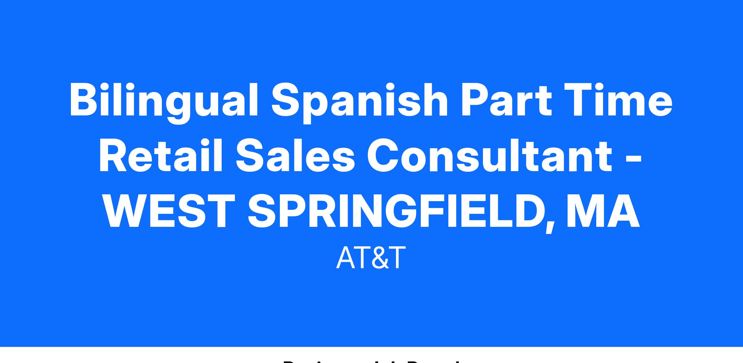 JobTitle : Bilingual Spanish Part Time Retail Sales Consultant - WEST SPRINGFIELD, MA (WEST SPRINGFIELD) JOBKEYJOBCODE : 16000025 Wage Scale/Schedule/ Class/Level : Y6 Time on Assignment (TOA) : Residency : Time in Title (TNT) : Job Family : CS Union Affiliation : Mobility Orange (Districts 1, 2-13, 4, 7, 9) Region : MBLT GENERAL DUTIES :The functions listed below are representative of duties performed by this job title. Duties generally include but are not limited to the following: