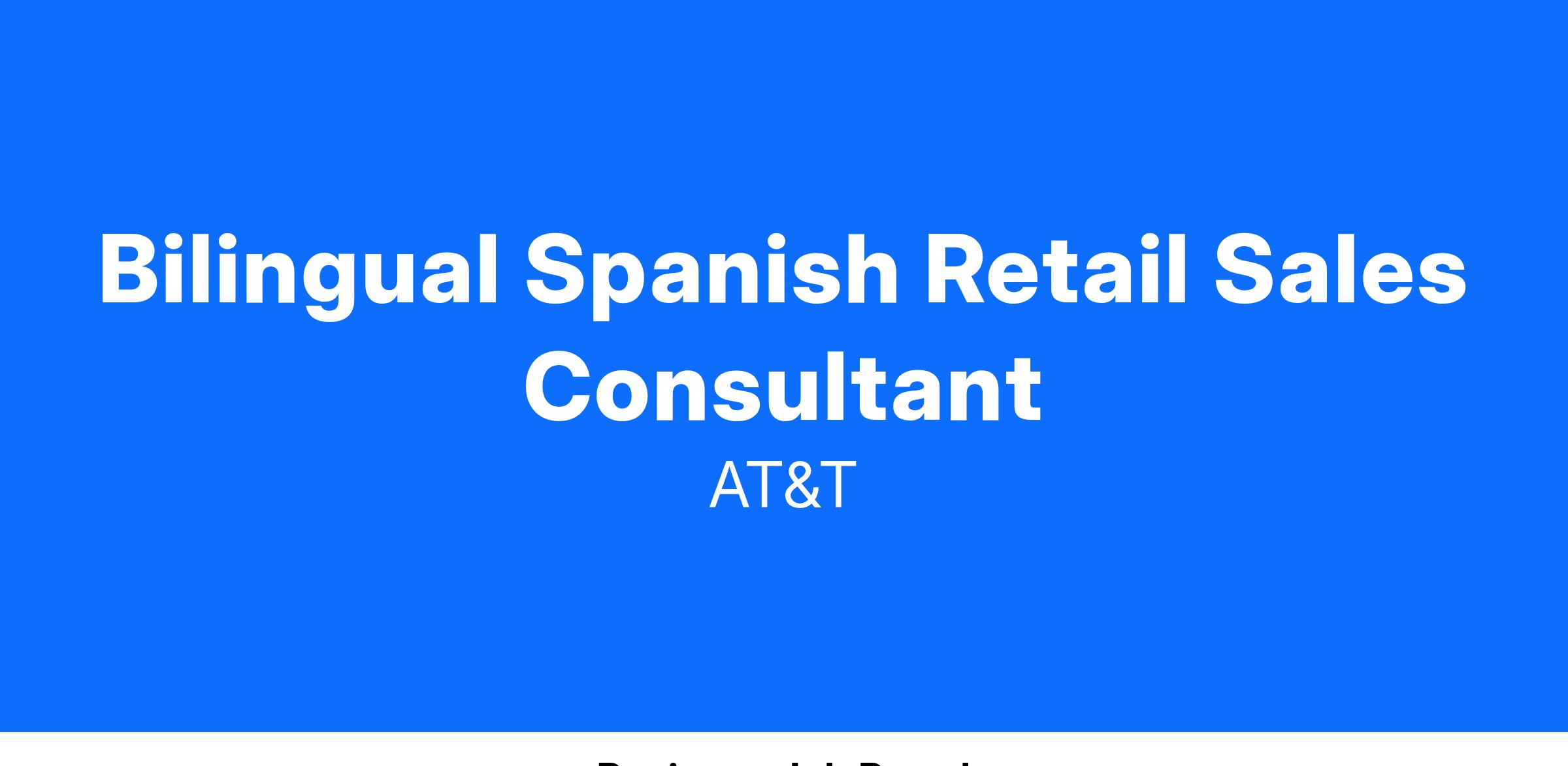 JobTitle : Bilingual Spanish Retail Sales Consultant - LAKEWOOD, CO (RMR BELMAR 1173 6G513) JOBKEYJOBCODE : 16000025 Wage Scale/Schedule/ Class/Level : Y6 Time on Assignment (TOA) : Residency : Time in Title (TNT) : Job Family : CS Union Affiliation : Mobility Orange (Districts 1, 2-13, 4, 7, 9) Region : MBLT GENERAL DUTIES :The functions listed below are representative of duties performed by this job title. Duties generally include but are not limited to the following: