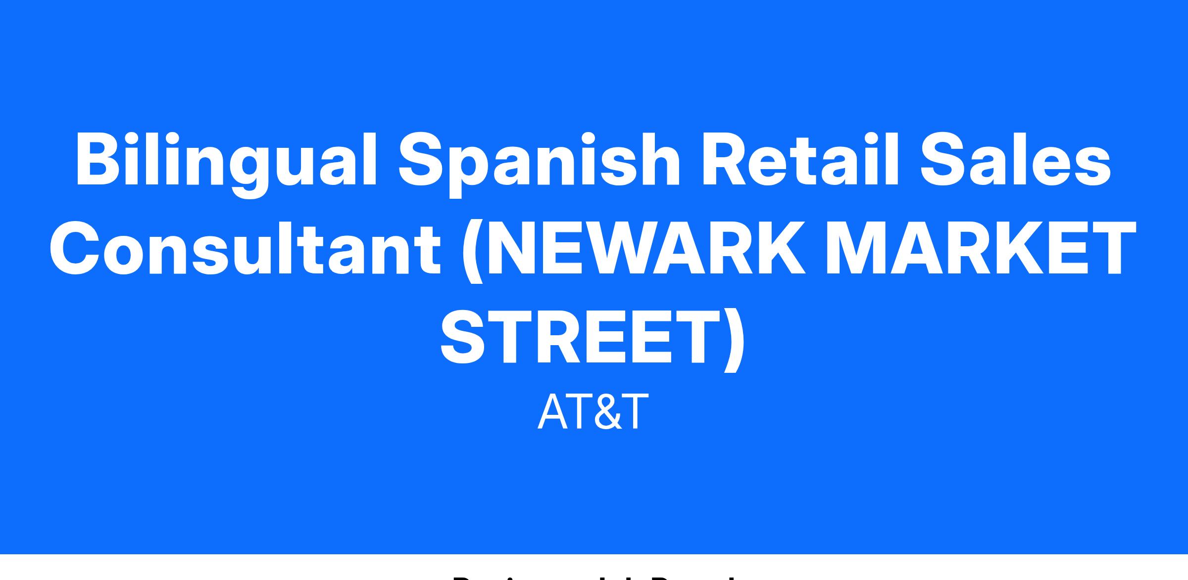 JobTitle : Bilingual Spanish Retail Sales Consultant - NEWARK, NJ (NEWARK MARKET STREET) JOBKEYJOBCODE : 16000025 Wage Scale/Schedule/ Class/Level : Y6 Time on Assignment (TOA) : Residency : Time in Title (TNT) : Job Family : CS Union Affiliation : Mobility Orange (Districts 1, 2-13, 4, 7, 9) Region : MBLT GENERAL DUTIES :The functions listed below are representative of duties performed by this job title. Duties generally include but are not limited to the following: