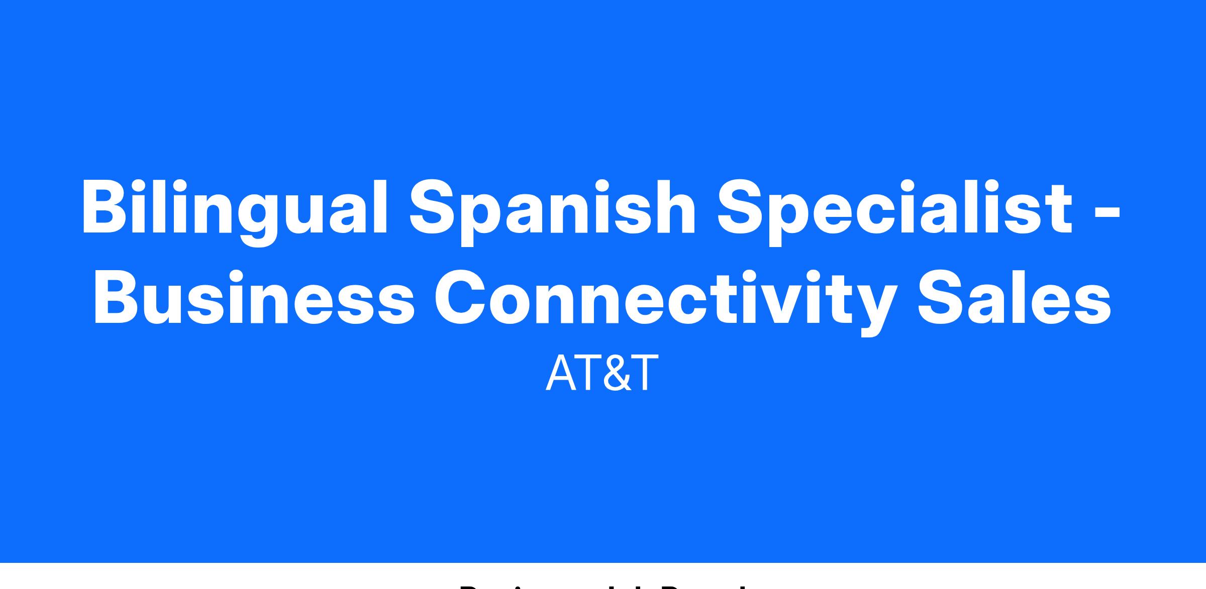 Our Bilingual Spanish Specialist - Business Connectivity Sales earn between $32,800 - $49,200 + commission with a total target compensation of $72,800 – $89,200. Not to mention all the other amazing rewards that working at AT&T offers. From health insurance to tuition reimbursement and paid time off to discounts on products and services just to name a few. There is a lot to be excited about around here. Individual starting salary within this range may depend on geography, experience, expertise, and education/training.