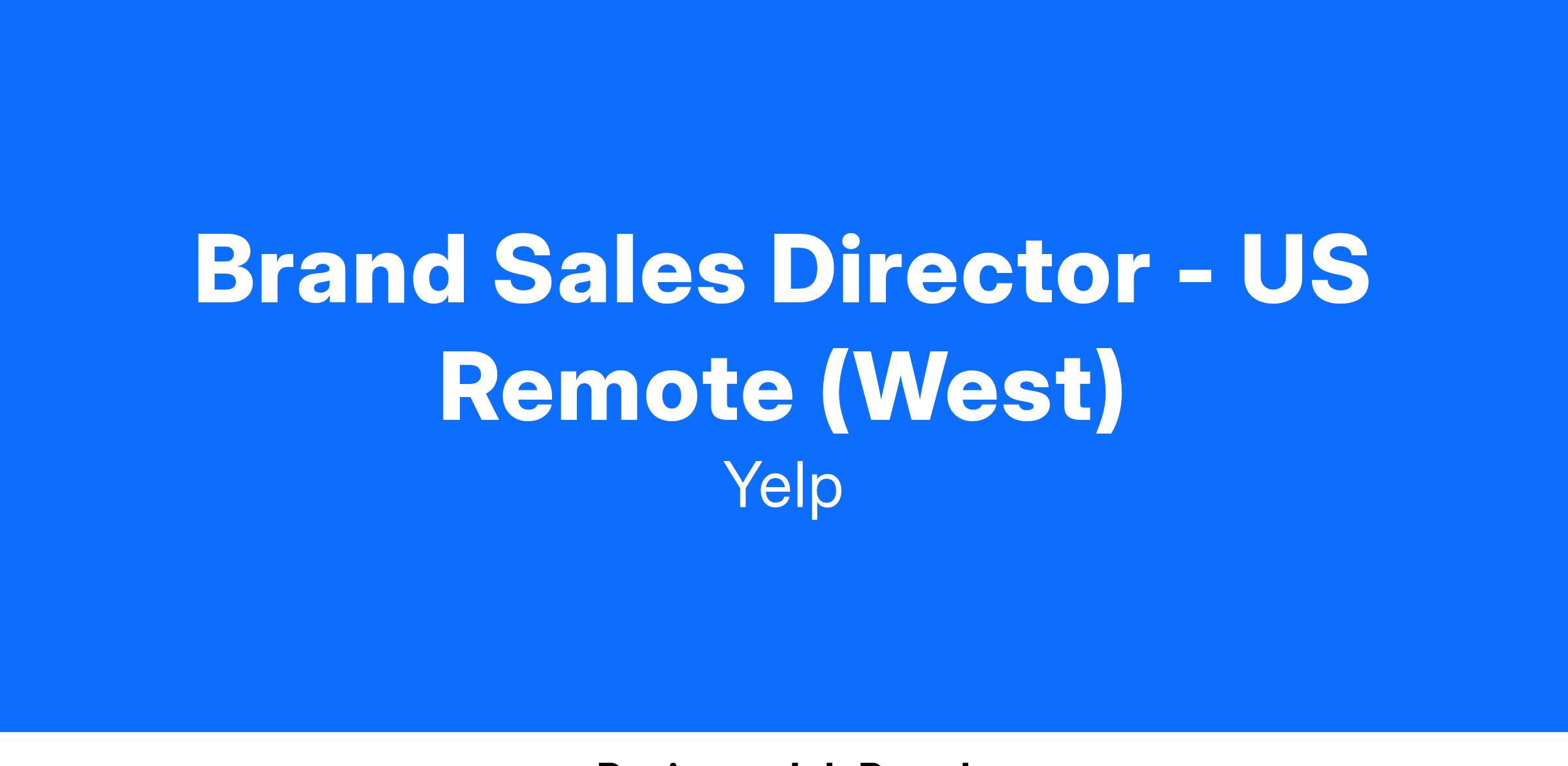 Summary Yelp’s mission is to connect people with great local businesses. Yelp’s Enterprise team partners with National businesses to provide industry leading digital advertising solutions. Yelp’s premium native search advertising products deliver strong ROI by helping clients connect with potential customers at the bottom of the purchase funnel. Yelp has become an essential part in the client's Local advertising mix and the Enterprise team is growing fast. We are looking for an entrepreneurial, sales driven leader to generate revenue with our search retargeting product, primarily through Agencies. You will develop and work a territory and drive new business from prospecting to close. As Yelp’s Brand Sales Director, you will drive revenue and growth of Yelp’s search retargeting products through our audience platform. To succeed in this role, you will need to have relevant digital or advertising sales experience and a demonstrated track record of exceeding goals. The Brand Sales Director role is key to Yelp’s success and offers significant career growth opportunities within Yelp’s Enterprise Sales team! We’d love to have you apply, even if you don’t feel you meet every single requirement in this posting. At Yelp, we’re looking for great people, not just those who simply check off all the boxes. What you'll do: Work across a territory of strategic accounts while prospecting for new accounts that are a strong fit for Yelp’s advertising solutions Take ownership of the full sales cycle from prospecting to close Develop relationships with key decision-makers across client organizations Build rapport and understand client’s business objectives and challenges that aligns Yelp’s search retargeting solutions to accomplish their goals Partner with clients & agencies to develop a strategy utilizing Yelp’s Audience Platform product Identify budgets within the client’s organization tied to driving in-store, e-commerce & brand sales to fund new Yelp campaigns Collaborate with Yelp’s Account Management and the Customer Success teams to ensure strong client experiences and program performance post-sale Lead ad hoc projects focused on the strategic revenue growth opportunities #LI-REMOTE #LI-TU1 What it takes to succeed: 6 + years relevant experience across Sales, Digital, Advertising and Agency roles. Proven track record of exceeding multi-million dollar Sales Targets You're not just comfortable exceeding Yelp’s revenue targets; you excel at closing deals worth $150,000 and more. Your entrepreneurial spirit is matched only by your ability to build partnerships from the ground up. Experienced communicator with proven track record of Executive outreach Motivated and tenacious with an unwillingness to settle for anything less than your best! Your hunger for personal and professional growth is insatiable, and you're always ready to take on new challenges. Your desire is crystal clear: you aim to make a significant impact on Yelp’s revenue and clientele. Entrepreneurial with history of building partnerships from scratch Ready and willing to roll up your sleeves and build something big at Yelp Easy-going, cool headed, with a track record of collaboration and working well internally Bought in to Yelp’s mission and naturally puts the company and team first Able to Travel 15-20% of the time What you'll get: Effective your first day: Full medical, vision, and dental Mental health support and services via Modern Health 15 days PTO (accrual begins on date of hire and increases with 2+ years of tenure thereafter), 12 paid holidays, plus one floating holiday Up to 14 weeks of parental leave Monthly wellness subsidy Flexible spending account 401(k) retirement savings plan Employee stock purchase plan Professional development reimbursement Work from home reimbursement Base salary is $110,000 + performance based incentives. For more information about US benefits at Yelp, please check out this link Closing At Yelp, we believe that diversity is an expression of all the unique characteristics that make us human: race, age, sexual orientation, gender identity, religion, disability, and education — and those are just a few. We recognize that diverse backgrounds and perspectives strengthen our teams and our product. The foundation of our diversity efforts are closely tied to our core values, which include “Playing Well With Others” and “Authenticity.” We’re proud to be an equal opportunity employer and consider qualified applicants without regard to race, color, religion, sex, national origin, ancestry, age, genetic information, sexual orientation, gender identity, marital or family status, veteran status, medical condition or disability. Actual salary offered may vary based on multiple factors, including but not limited to, an individual's location and experience. We will consider for employment qualified candidates with arrest and conviction records, consistent with applicable law (including, for example, the San Francisco Fair Chance Ordinance for roles based in San Francisco, the Los Angeles County Fair Chance Ordinance for roles based in the unincorporated areas of Los Angeles County, and the California Fair Chance Act for roles based in California). We are committed to providing reasonable accommodations for individuals with disabilities in our job application process. If you need assistance or an accommodation due to a disability, you may contact us at accommodations-recruiting@yelp.com or 415-969-8488. Note: Yelp does not accept agency resumes. Please do not forward resumes to any recruiting alias or employee. Yelp is not responsible for any fees related to unsolicited resumes. US Recruiting and Applicant Privacy Notice #LI-Remote