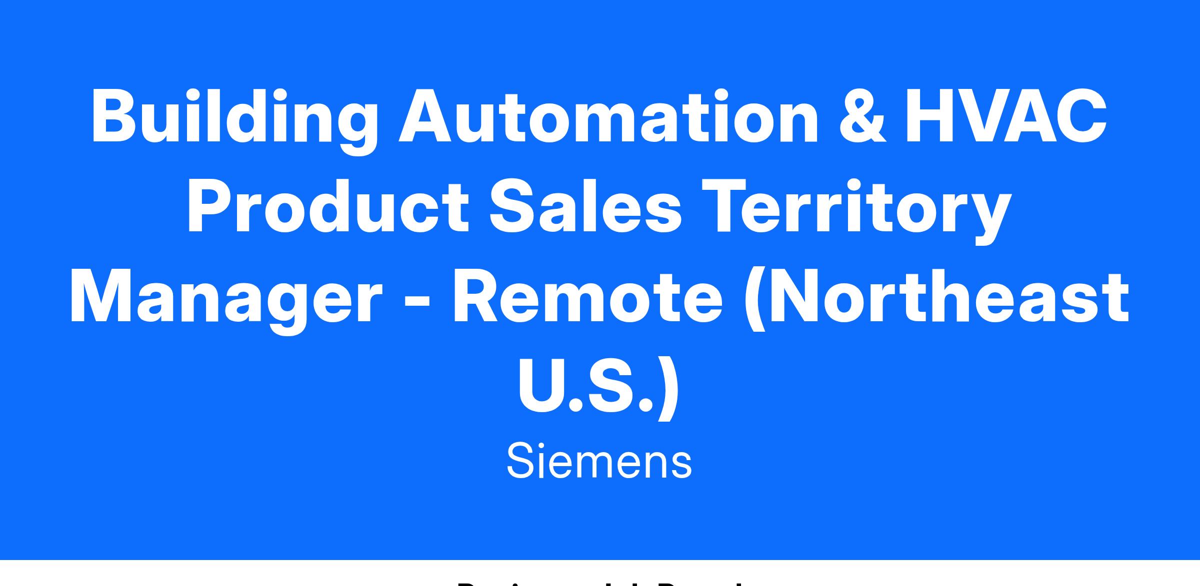 We are looking for a Sales Territory Manager located in the Northeast United States who is responsible for managing and driving building automation controls and HVAC Product sales through contractor and distributor channels. While this position is remote, the Sales Territory Manager should be located near one of our branch locations and will travel up to 50% within the Northeast United States. Branch locations include: