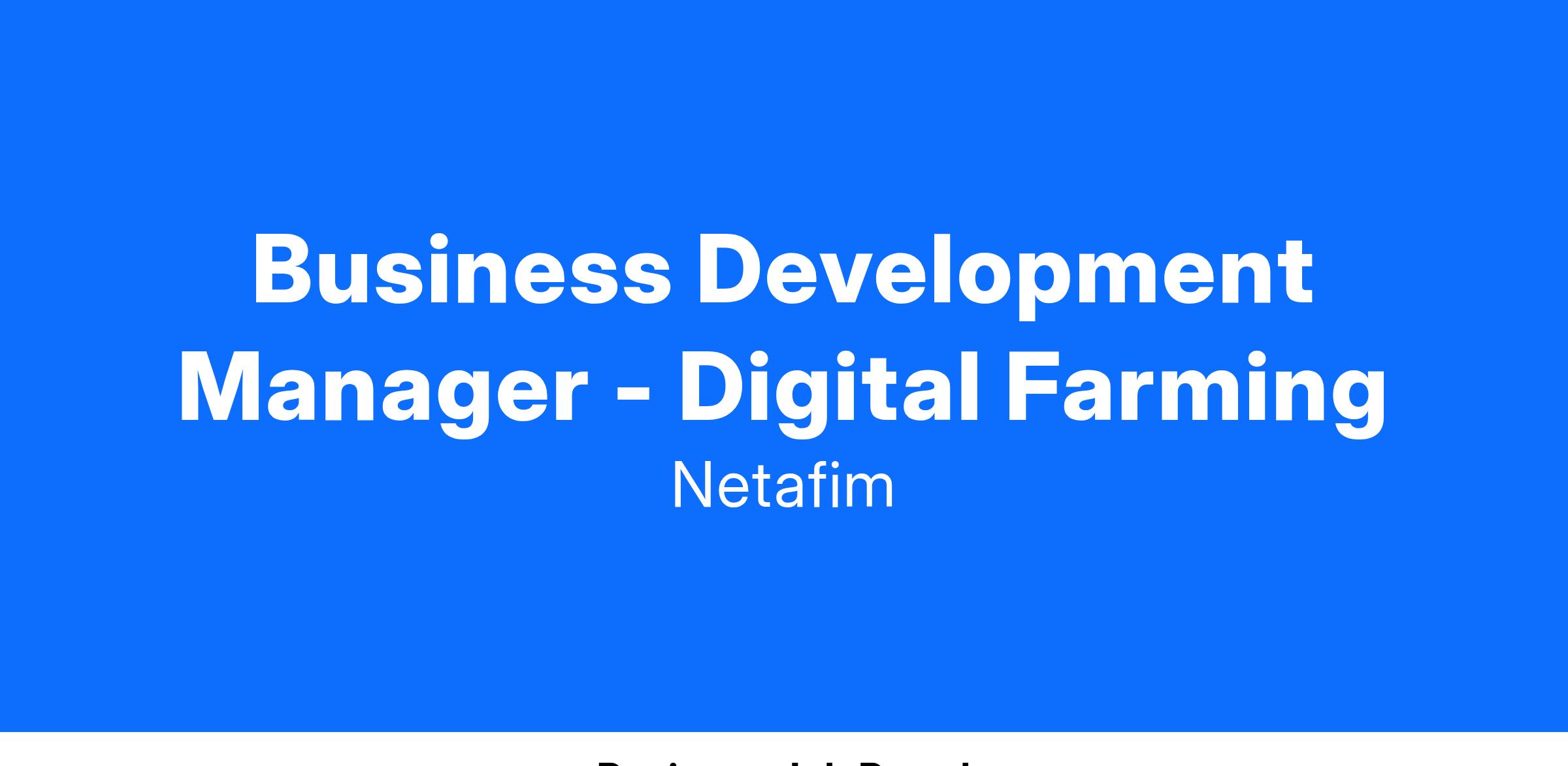 As a key member of the Netafim Business Development team, the Business Development Manager (BDM), Digital Farming will be the pivotal role in developing and executing the commercial strategy of our digital farming business in the USA and Canada. This key individual role will play a central part in the development and execution of our digital farming initiatives, responsible for shaping our long-term channel strategy for digital farming and developing a comprehensive strategy for growth in the digital farming space. In close collaboration with the digital farming product team, this highly visible role will be responsible for the upcoming launch of our new GrowSphere operating system, as well as the strategy and commercial execution of the existing digital farming portfolio which includes fertilizer injectors and water treatment solutions. This role will closely interface with our commercial team and channel partners to successfully achieve our digital farming objectives.