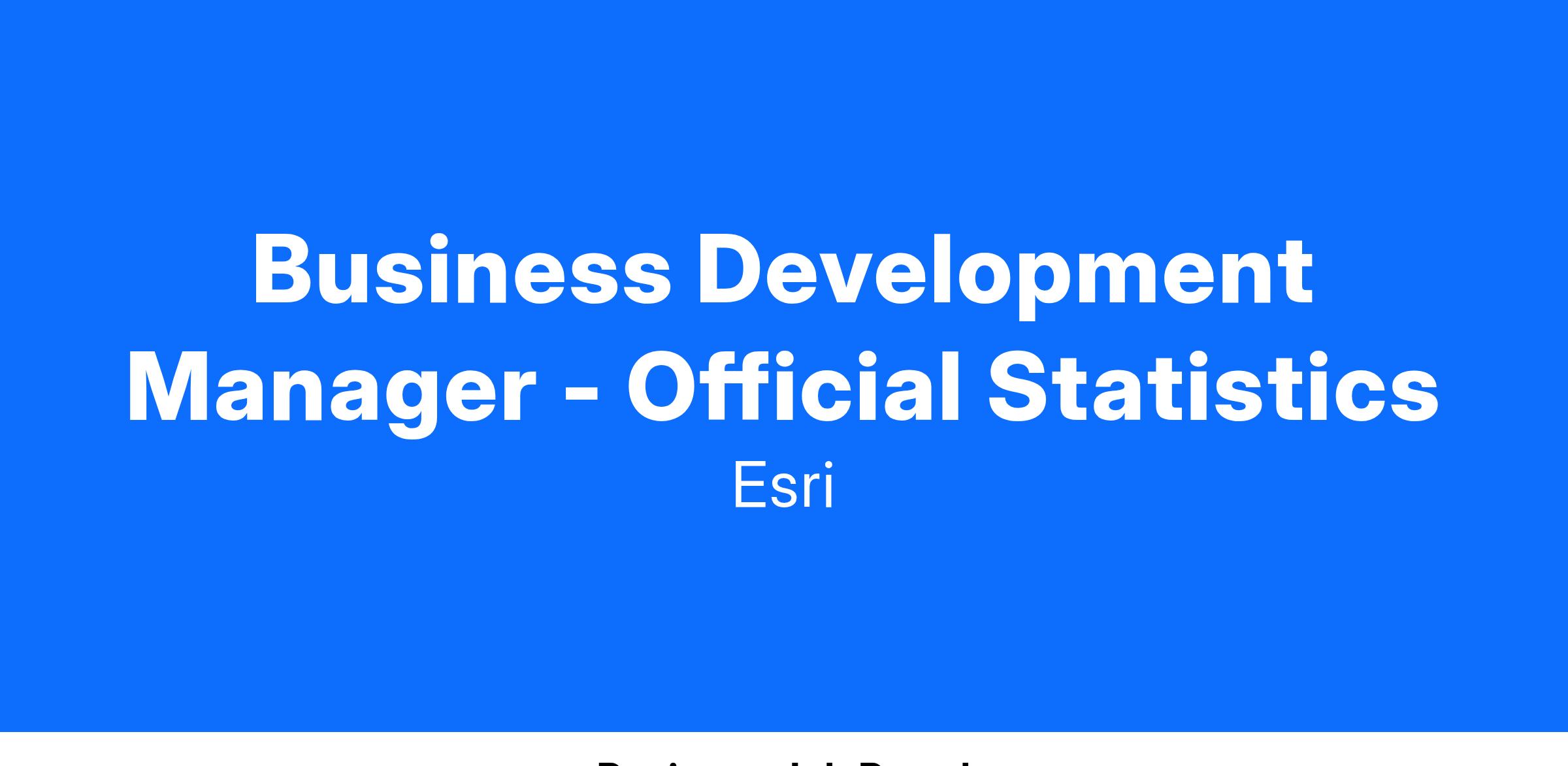 At Esri, our business development managers collaborate with distributors to co-sell and promote the adoption of Esri technology. We invite you to utilize your enterprise sales and multi-channel software business development experience to provide geospatial software and solutions to the global community of census and official statistics organizations. You’ll work closely with Esri’s account teams, distributor network, and business partners to help customers optimize and expand adoption of Esri technology, identify new areas of growth, and deliver expertise that helps deliver on their mission and vision.
