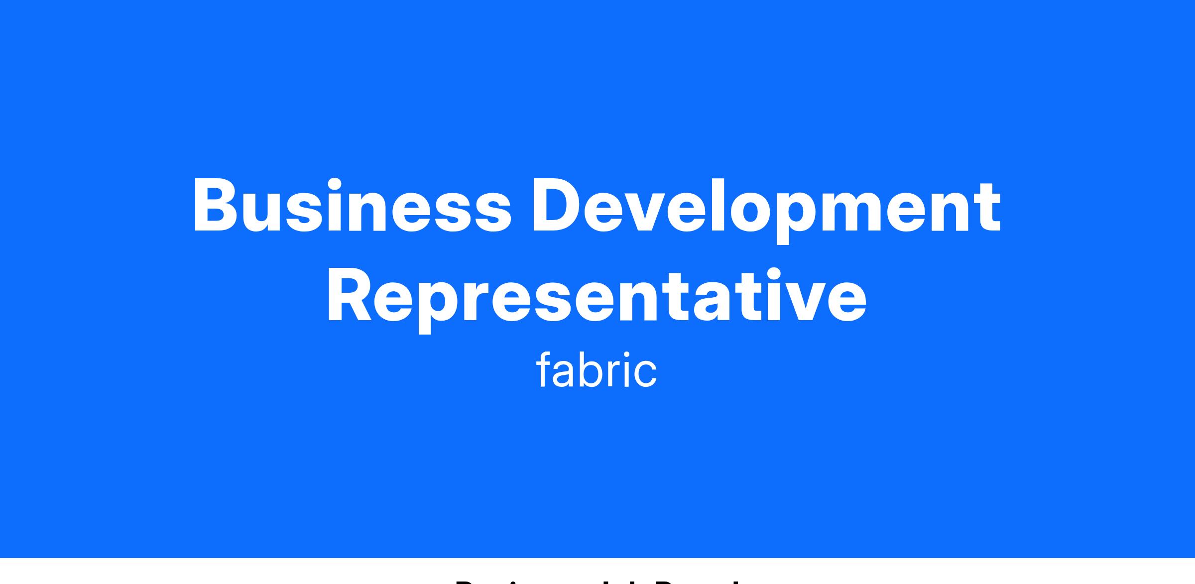 fabric is looking for a highly motivated, outgoing, and tech-savvy sales representative with strong business acumen to join our growing Sales & Business Development team. As a Business Development Representative, you will generate new business by prospecting outbound leads through cold outreach and work collaboratively across our sales organization to set high-value meetings. This is a highly strategic role that requires creativity, resilience, and the ability to partner effectively with an Account Executive to create new business opportunities. We intend for all our SDR/BDR reps to excel, learn and grow in hopes they will add value in other roles within fabric after ~16-24 months.