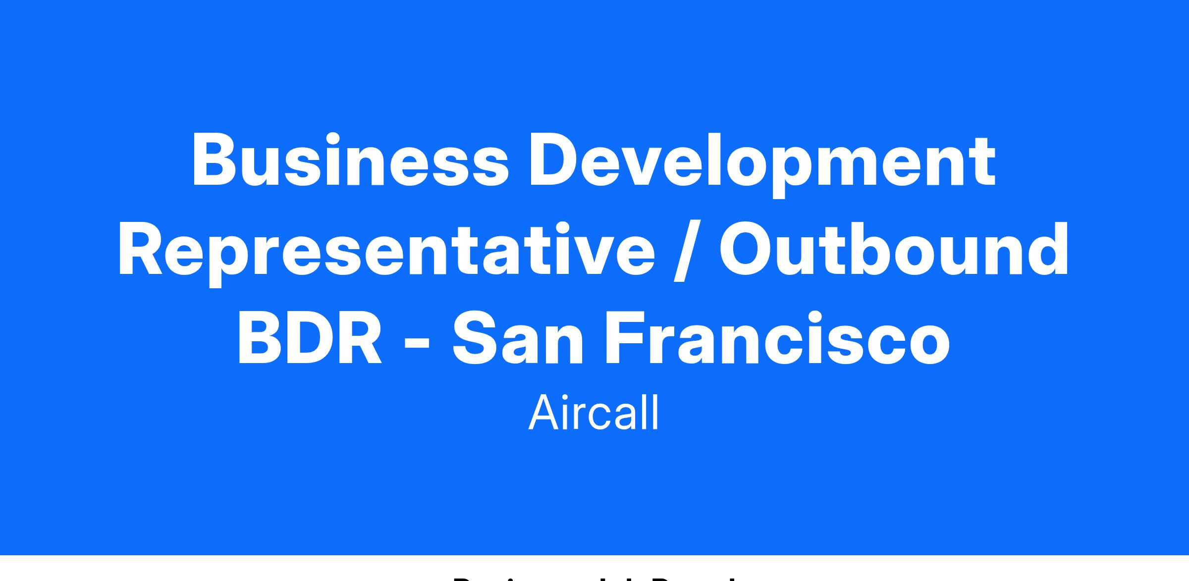 As a Business Development Representative, you’ll be an integral part of our North America Sales team that works collaboratively with Account Executives as you build your career at Aircall through our Sales Career Track. It’s a fast-paced role and a perfect entryway into sales within the SaaS space. Learn the fundamentals of expanding Aircall's customer base by prospecting, qualifying potential customers, and, with success, moving into an outbound closing role.