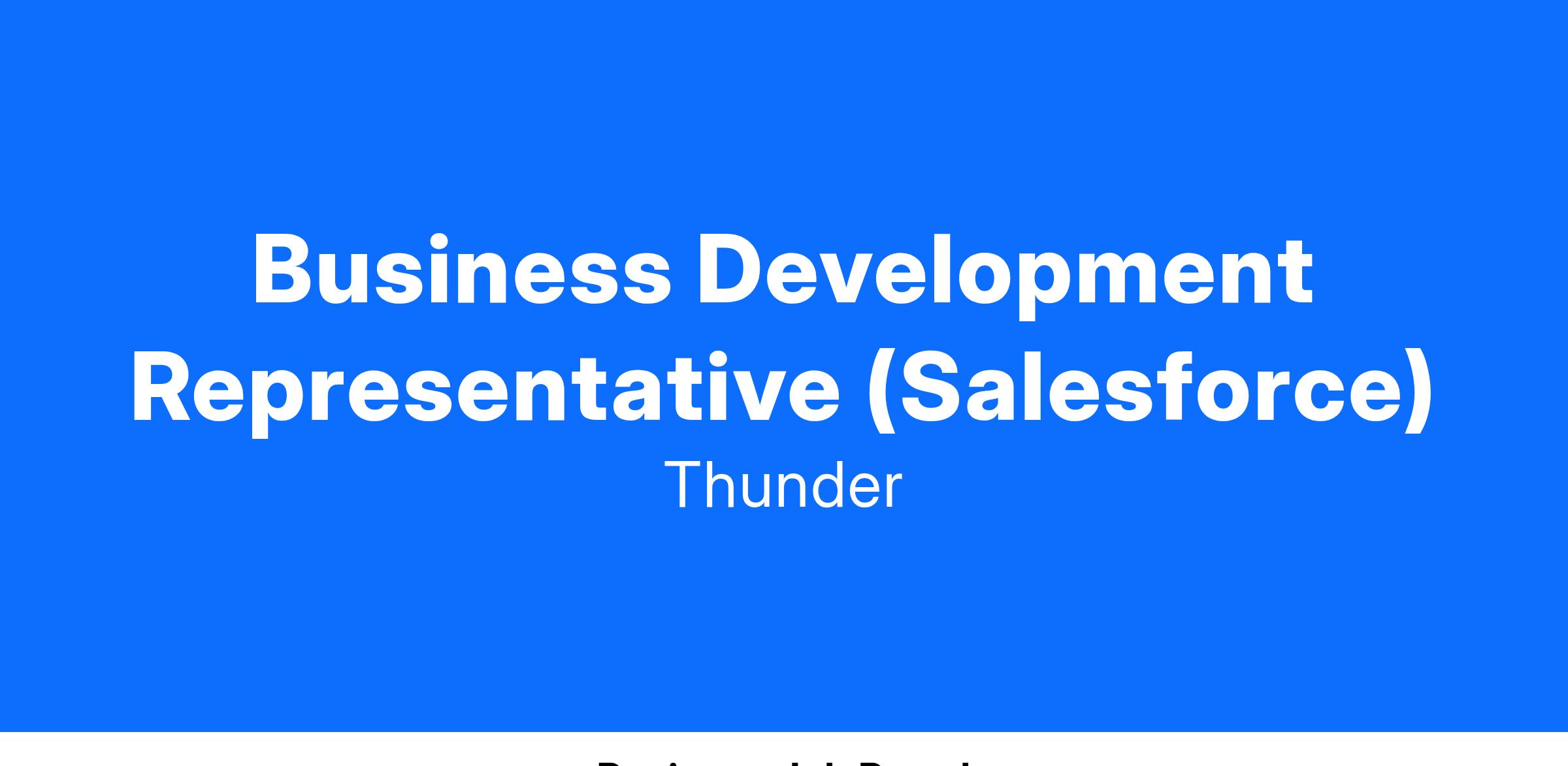 Thunder closed our Series A fundraising round in August 2023, and is again investing in our amazing Sales and Accounts team. As our proven selling playbook continues to evolve, we are seeking a dedicated Salesforce Market Development Executive (otherwise known as a BDR or SDR) who brings strong communication skills, Salesforce knowledge, fearless energy, and confidence to call across an organization and into the C-suite. Our ideal candidate (YOU!), has an appetite for learning and a collaborative approach in working with the Client Directors (Account Executives) that you support.