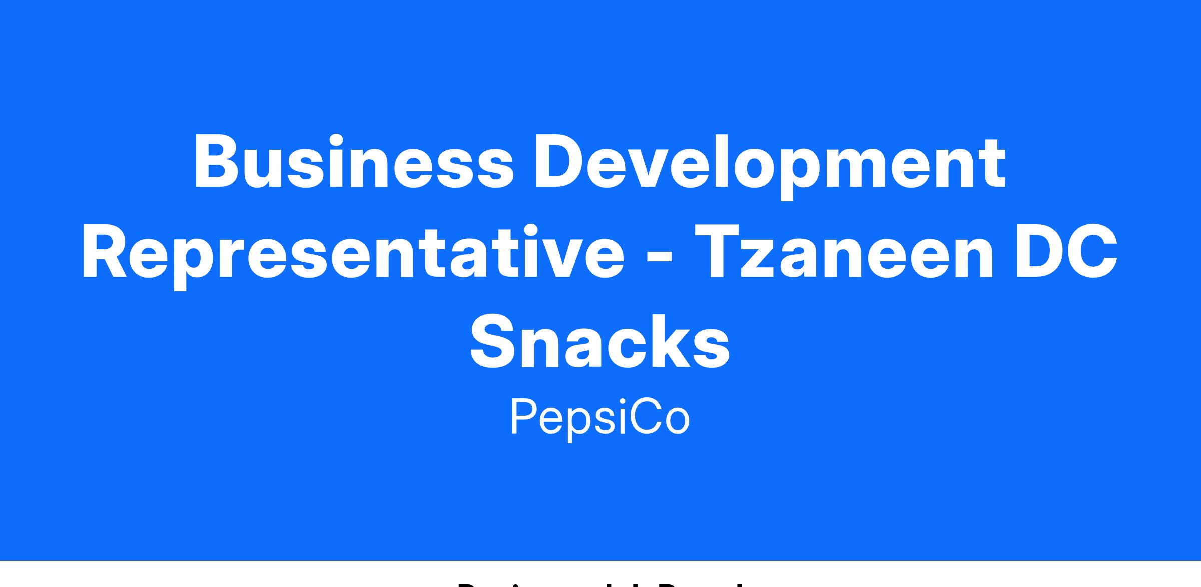Overview We are PepsiCo PepsiCo is proud to be one of the world’s leading food and beverage companies. Every day, we are dedicated to bringing our mission to create more smiles with every sip and every bite to life. Our products are enjoyed more than one billion times a day in more than 200 countries and territories around the world. Our portfolio — including Lay’s, Doritos, Gatorade, Pepsi and Quaker — consists of many iconic brands that generate more than US $1 billion each in estimated annual retail sales, helping to deliver more than US $70 billion in net revenue in 2020. Guiding PepsiCo is our vision to Be the Global Leader in Beverages and Convenient Foods by Winning with PepsiCo Positive. Through PepsiCo Positive, we are charting a new course to drive positive action for the planet and people. PepsiCo Positive is an end-to-end strategic business transformation with sustainability at the centre of how we will create growth and value by operating within planetary boundaries and inspiring positive change. In South Africa (SA), you will find our products across the region at breakfast, lunch or dinner. At the gym or on the field. In the office or on the go. We refresh, restore and rejuvenate our consumers all day, every day with our key brands including Simba, Lay's, Liqui Fruit and Bokomo range of cereals. PepsiCo SA employs more than 13, 000 people across our three business divisions: Bakeries, Grains, Foods, Fruit, Snacks, Juice & Beverages. Responsibilities Accountabilities Achieves maximum Revenue profitability, growth and Channel penetration within an assigned territory and/or market segment (Forecourts/TTM/Horeca- Speciality/Wholesale or by effectively selling the company's products. Direct contacts with Customers and secures new business and Following up on new business opportunities (sell through-after 3 months)-5 to 15 case customers. Key KPI’s (see a minimum 35 customers-Max 40), to grow customer and move to 20case and move over to Key Accounts (CSL). Communicate to and educate all customers in Category Management systems and become the snack category champion within area of operation. Forward share management Implementation of Golden Store (KPI) Liaise with external merchandising services to achieve the most effective merchandising practices/principles. Increase Market share% Qualifications Key Skills/Experience Required 5-7 years "current" experience in Sales/Business Development in the enterprise A deep understanding of marketing principles and great negotiation skills The ideal candidate should bring with them strong networking sales background and significant connections in sales Arena. Must be able to demonstrate a strong track record of achievement. Self-starter who is able to successfully work both independently and as part of a team. Integrity, Intelligence, “I can do it” attitude Strong motivation for closing business and meeting sales targets. Degree educated or equivalent industry experience and accreditation. Must possess excellent written and oral communications skills. Outstanding presentation skills required. Experience with direct selling is preferred. “PepsiCo is an Equal Opportunity Employer in line with the Employment Equity Act"