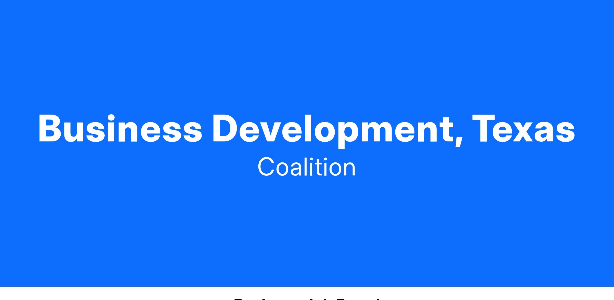 Business Development at Coalition is about creating and maintaining relationships with our brokerage partners and customers. We are looking for seasoned sales professionals to join our Business Development team and help us develop and empower the success of our partners by matching Coalition’s best ideas, innovations, and capabilities with a broker’s business goals.