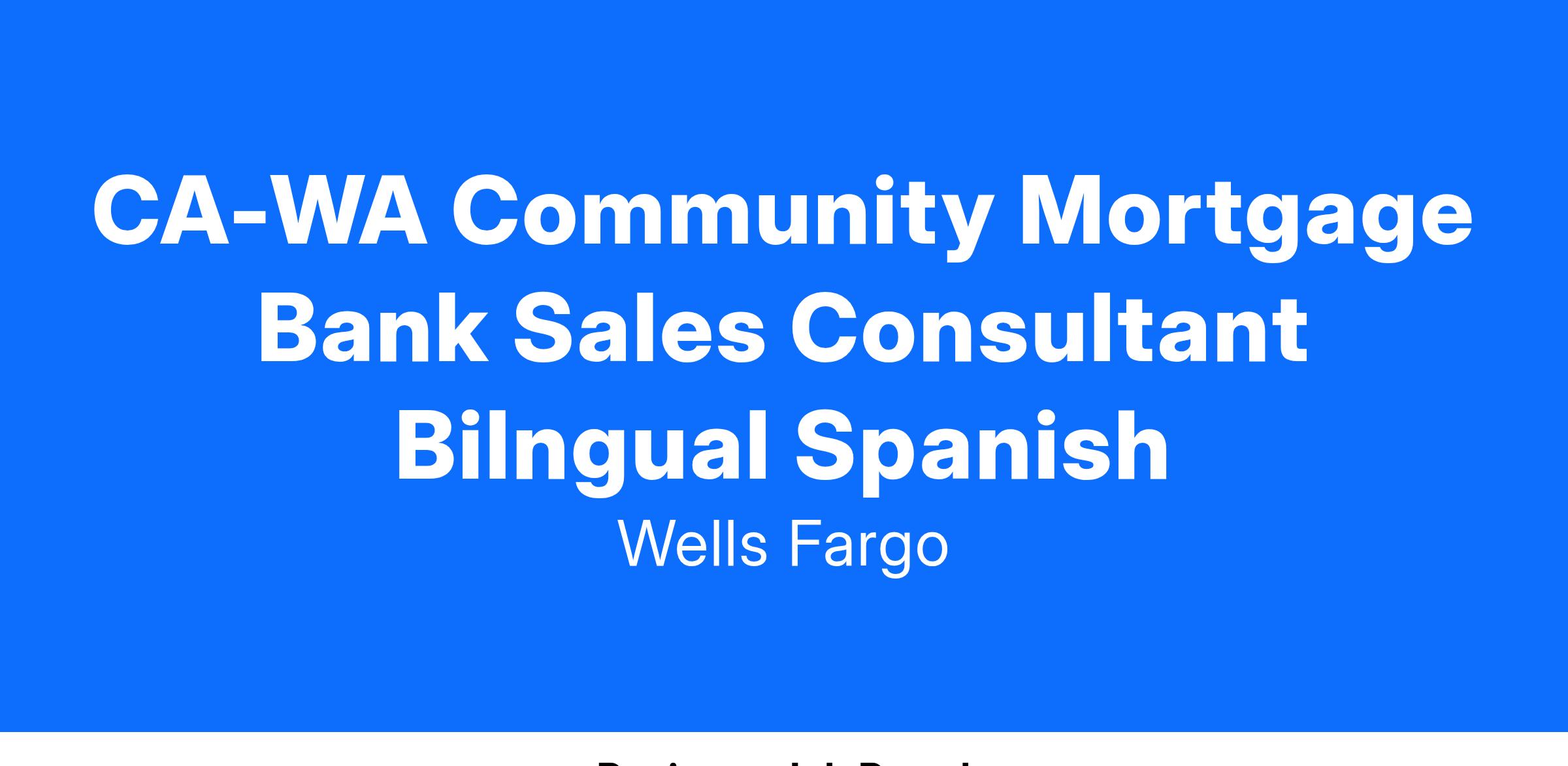 Wells Fargo is seeking a Community Mortgage Bank Sales Consultant (SAFE) in Consumer Lending as part of Home Lending. For additional information on this line of business, refer to the external Careers Site at www.wellsfargojobs.com.
