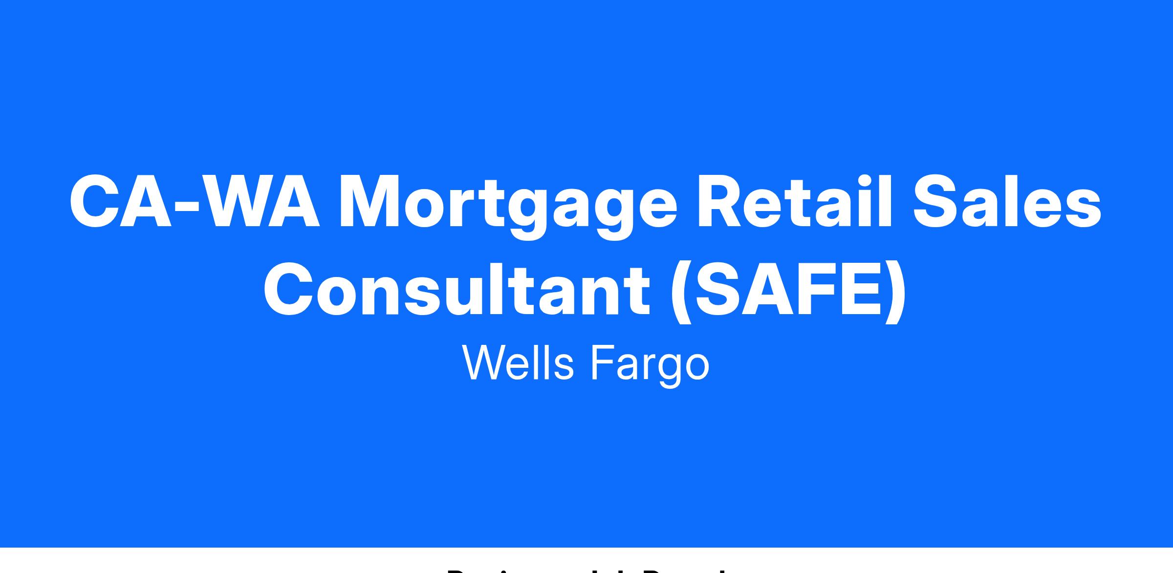 Wells Fargo is seeking an CA-WA Mortgage Retail Sales Consultant (SAFE) in Consumer Lending as part of Home Lending. Learn more about our career areas and lines of business at wellsfargojobs.com.