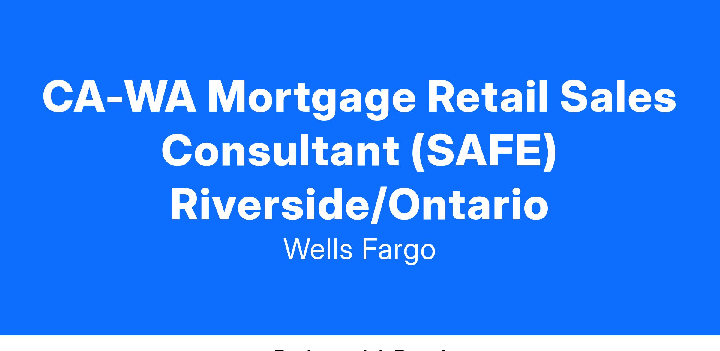 Wells Fargo is seeking an CA-WA Mortgage Retail Sales Consultant (SAFE) in Consumer Lending as part of Home Lending. Learn more about our career areas and lines of business at wellsfargojobs.com.