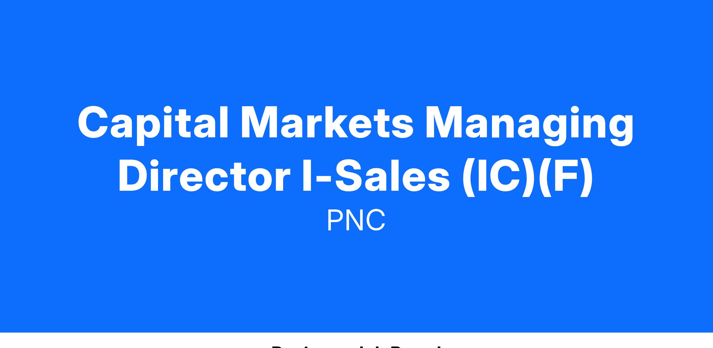 At PNC, our people are our greatest differentiator and competitive advantage in the markets we serve. We are all united in delivering the best experience for our customers. We work together each day to foster an inclusive workplace culture where all of our employees feel respected, valued and have an opportunity to contribute to the company’s success. As a Capital Markets Managing Director I - Sales within PNC's Capital Markets organization, you will be based in New York, NY.