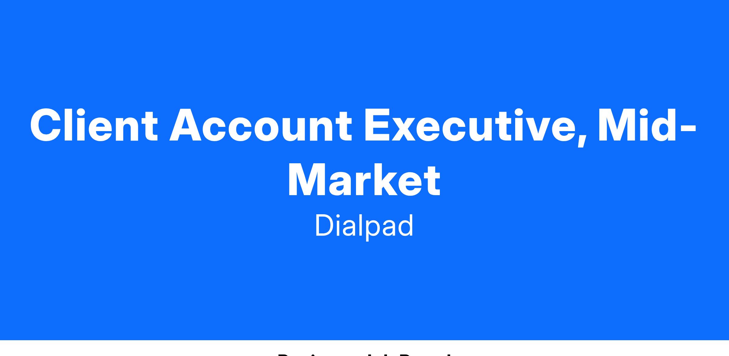A Client Account Executive, Mid-Market at Dialpad is responsible for providing best in class strategic account management across a portfolio of existing Dialpad customers while growing YoY revenue. Serving as a consultant to the client, the CAE will show the value of what's possible through the implementation of additional Dialpad product suite offerings.