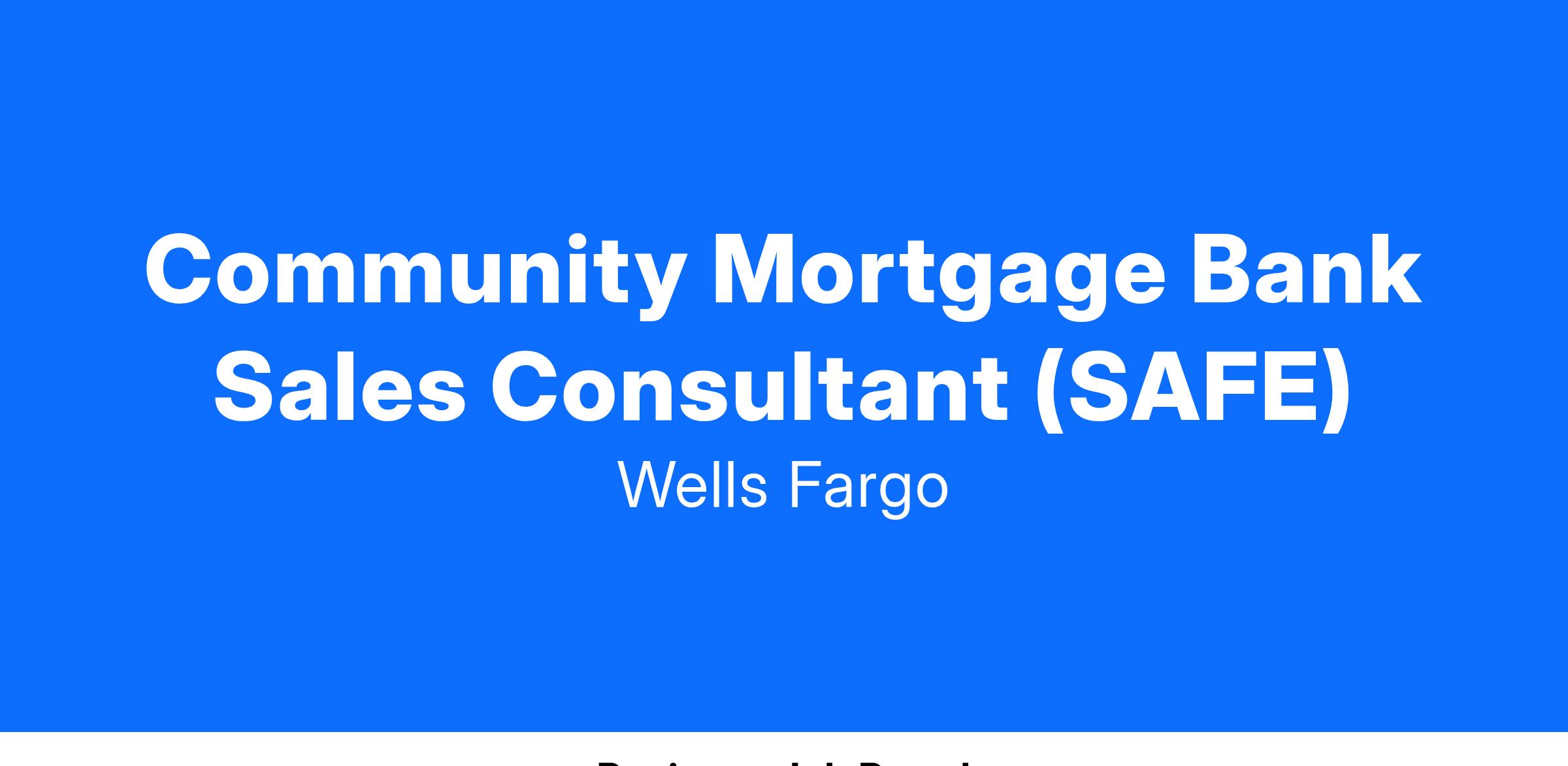 Wells Fargo is seeking a Community Mortgage Bank Sales Consultant (SAFE) in Consumer Lending as part of Home Lending. For additional information on this line of business, refer to the external Careers Site at www.wellsfargojobs.com.