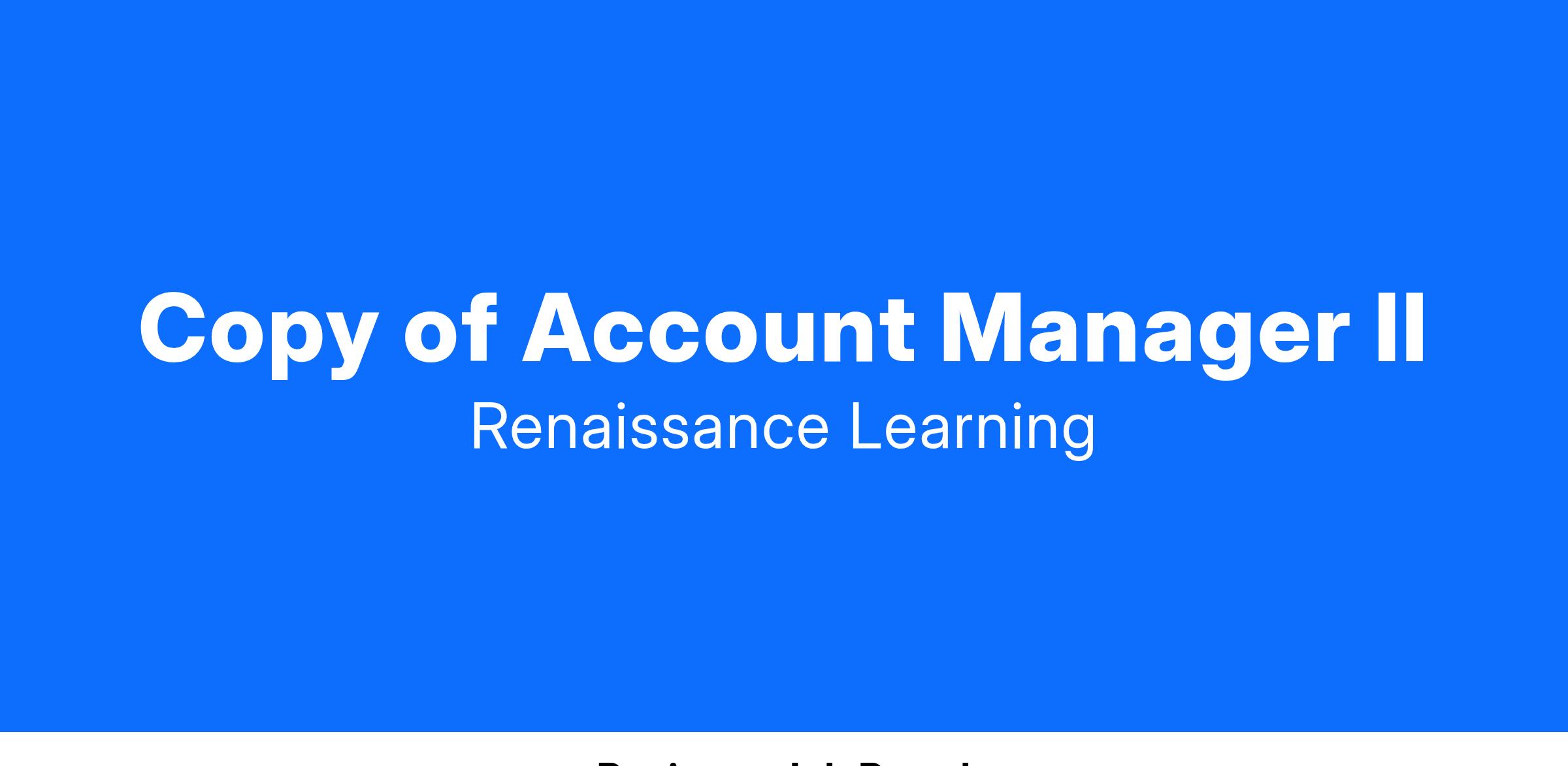 The Account Manager II is responsible for managing and selling Renaissance Learning’s products and services, with a focus on Practice and Instruction, within assigned territory, and achievement of revenue goals through prospecting, new business, customer renewals, cross-sell, and up-sell opportunities.