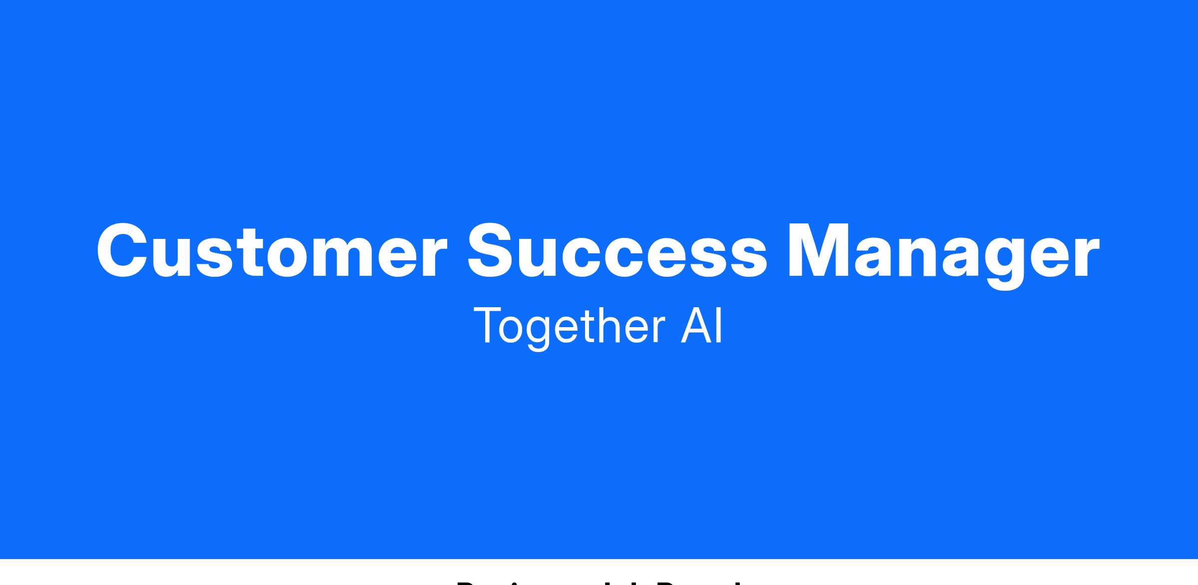 About the role: As a Customer Success Manager at a pioneering AI company, you'll be the guiding light for our customers, ensuring they get the most value out of our training, fine tuning and inference stack. You will navigate complex business and technical challenges, project manage large AI infrastructure initiatives and navigate critical executive relationships. As a part of the Customer Experience organization, you will collaborate closely with Product and Sales, driving continuous improvement of our offerings. This is an exciting opportunity for someone knowledgeable and passionate about AI to make a significant impact in a fast-paced, customer-first environment.
