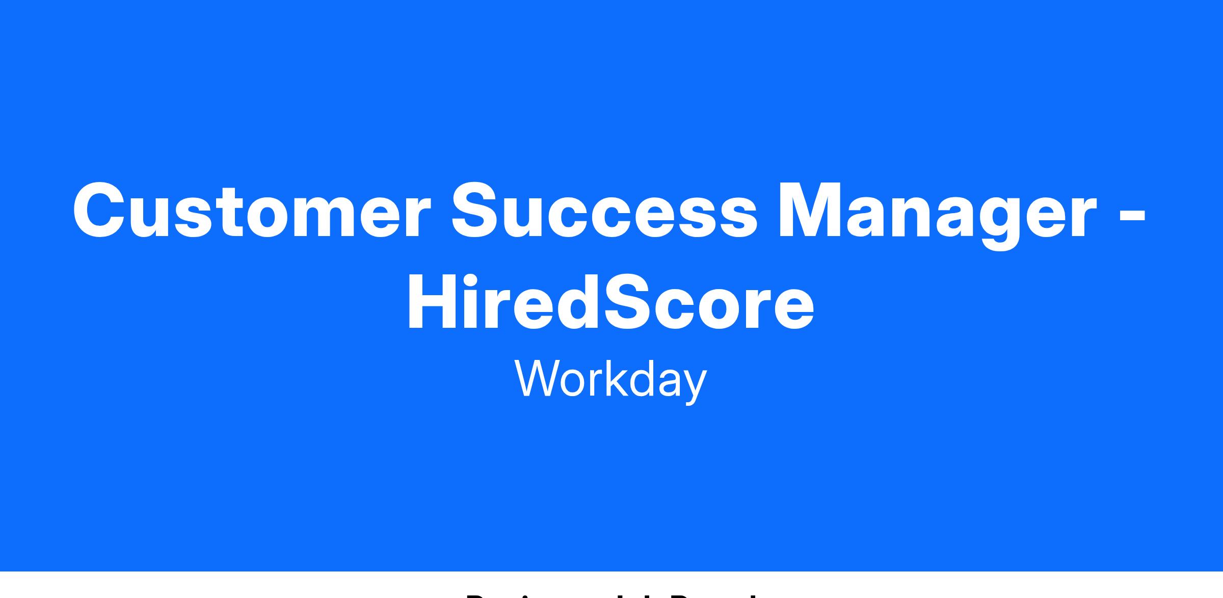 Come join our team and experience Workday + HiredScore! As a Workday + HiredScore Customer Success Manager, you'll play a pivotal role in ensuring our customers realize maximum value from their Workday + HiredScore investments through comprehensive adoption and value engagements. We prioritize delivering exceptional experiences that support our customers throughout their business lifecycle. Through regular reviews, we identify achievements and uncover fresh opportunities for success. Our team has diverse backgrounds and experiences, all unified in our mission to empower our customers to succeed. We are a global organization spanning North America, EMEA, and APAC.About the Role