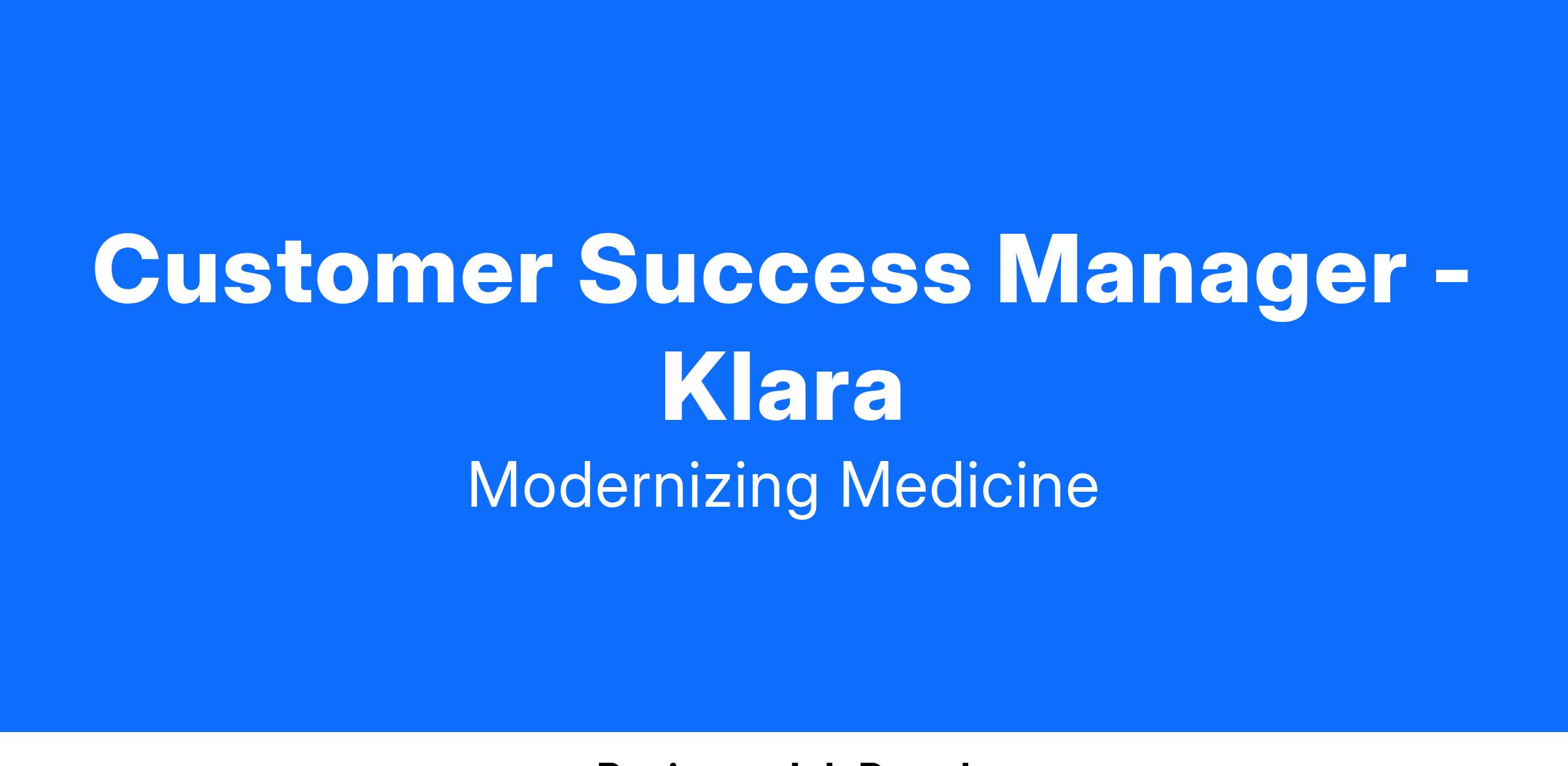 ModMed is hiring a driven Customer Success Manager to join our positive, passionate, and high-performing Strategic Customer Success team focused on acting as the post-sale consultative partner and trusted advisor to our Klara clients, and is responsible for the retention and advocacy of an assigned book of business. This is an exciting opportunity to serve as the primary relationship owner between our strategic customers and internal stakeholders within a fast-paced Healthcare IT company that is truly Modernizing Medicine! The CSM will be held accountable for articulating the value of our SaaS cloud platform while driving customer engagement and adoption of the Patient Collaboration tool. It is expected that the CSM will understand their customer’s business goals and advocate on their behalf by proactively identifying risk(s) and collaborating internally to deliver solutions and identify appropriate upsell opportunities.