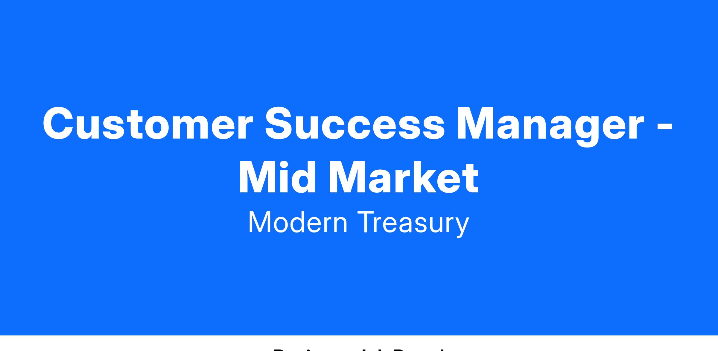 We’re looking for a Customer Success Manager to join our team. You will be critical to our customers’ success as they build, expand, and deepen their relationship with Modern Treasury. You will also help our Engineering, Product, and Design teams stay close to customer needs and market trends. We work with our customers daily, and it’s important to us that we incorporate their feedback as we build.