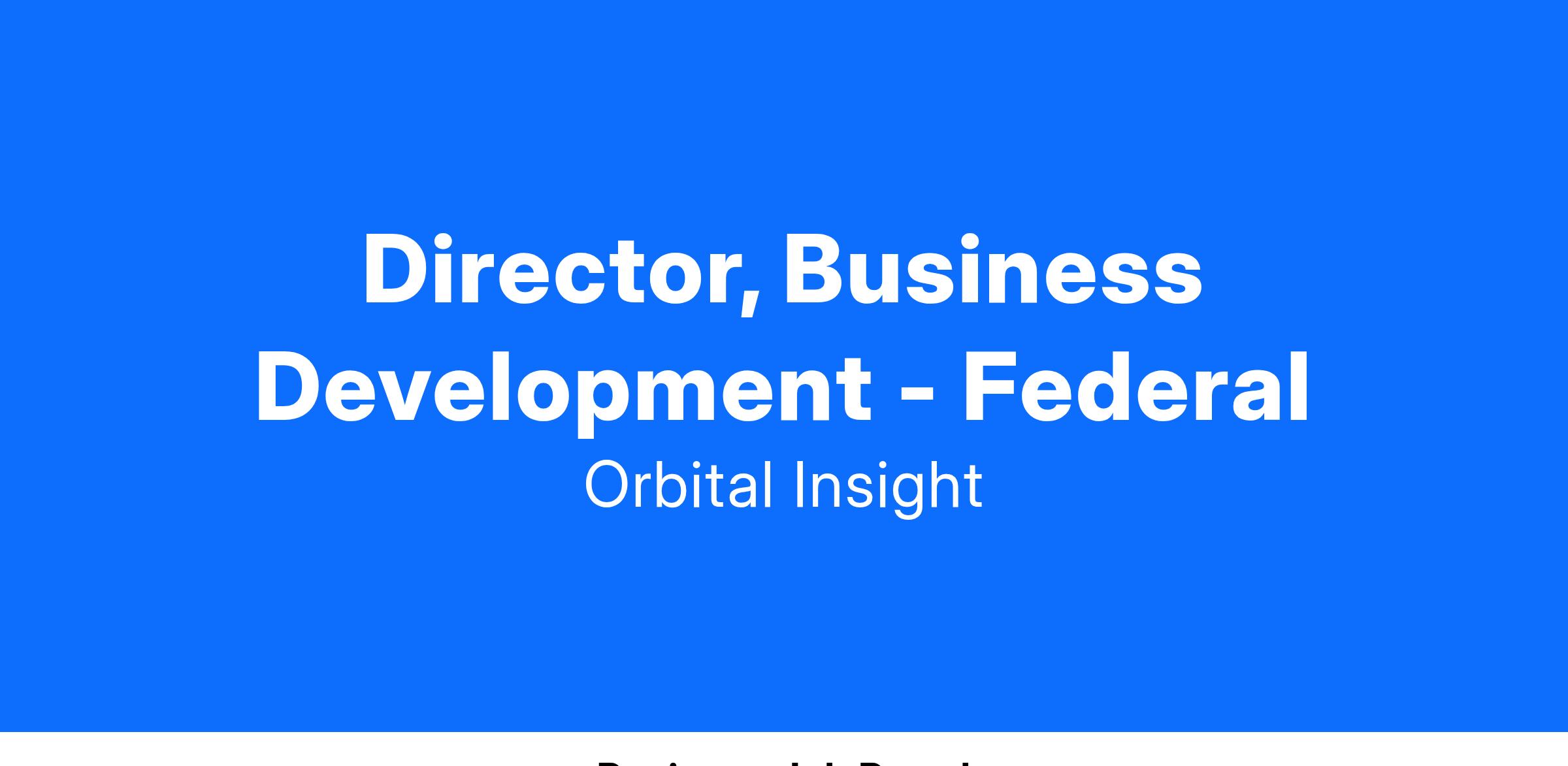 Orbital Insight, Inc. is seeking a Director of Federal Business Development to join our Federal team. As our Director of Federal Business Development, you will be responsible for leading Federal capture for specific opportunities, strengthening and evolving partnerships to produce new opportunities, and consistently build customer relationships to ensure long term contract growth. You will identify new opportunities and support by growing the multi-year pipeline. This role will require you to regularly collaborate with our Product and Engineering teams to prioritize features needed for opportunities and to grow the long term pipeline.