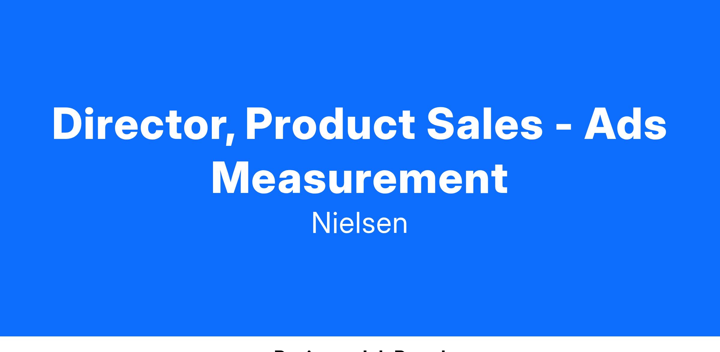 The Director, Product Sales will lead our Ads Measurement business for Advertiser and agency clients. This role will engage with clients directly to identify needs and determine the measurement products and solutions that address their business objectives. This individual will draw upon a deep understanding of industry and analytical capabilities to develop, pitch, and deliver a complete solution. The Director will work with internal sales partners on client proposals and present compelling pitches that demonstrate Nielsen’s value, winning both new and repeat business. This person will collaborate with Nielsen leaders in marketing and product to ensure go-to-market strategies and deliverables meet revenue, client and marketplace expectations.