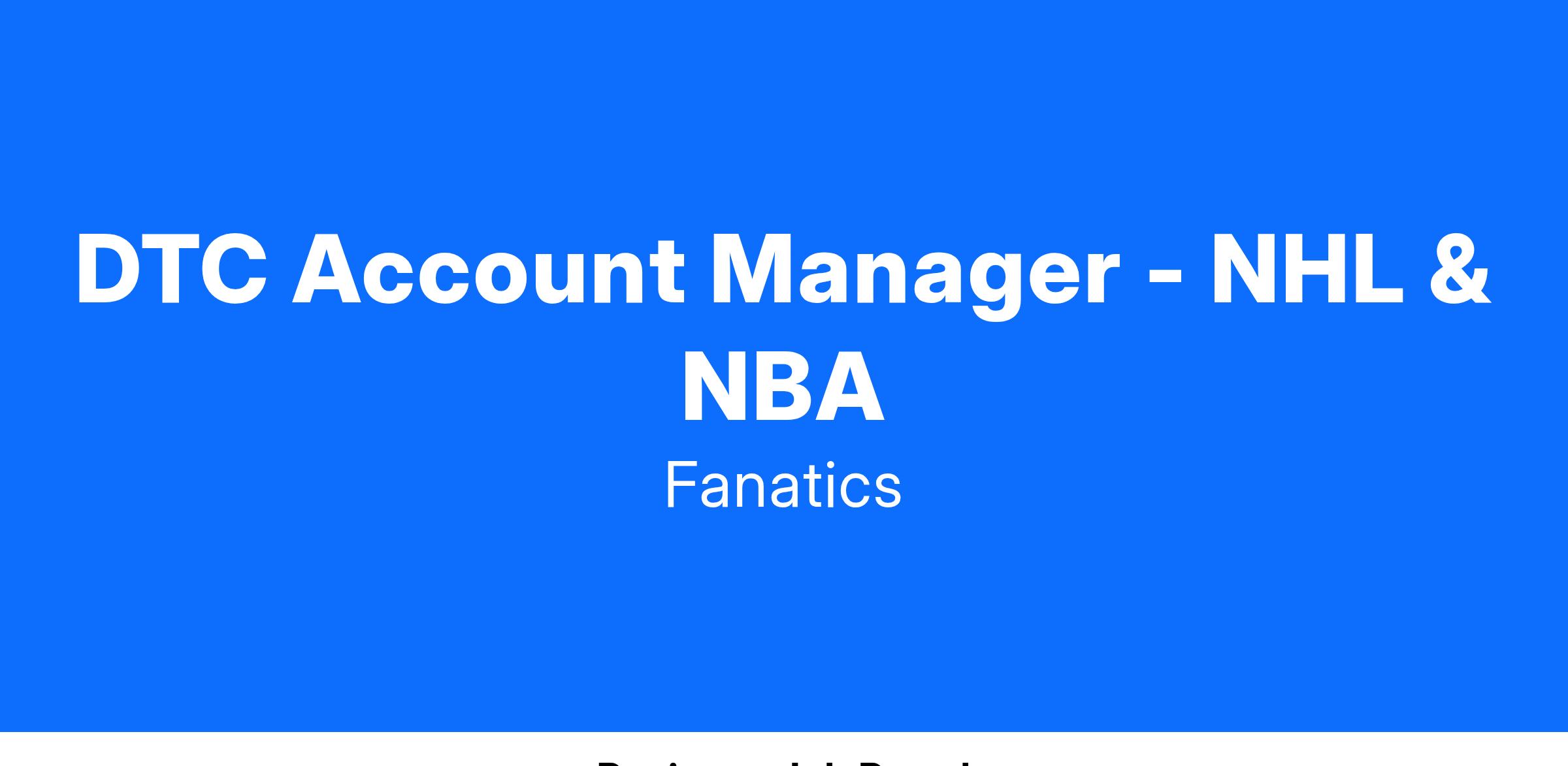 · Determined and Relentless MindsetAs a Direct-to-Customer (DTC) Account Manager at Fanatics, you will be responsible for managing all aspects of the sales process with our DTC and IVR partners. This role will work across the NHL and NBA leagues and markets to achieve first-party Sales and Fanatics Brands Goals. You will develop and maintain strong relationships with all cross-functional partners throughout the Commerce team and identify new business opportunities and better processes to drive growth. This role requires a proactive approach to collaboration, excellent communication skills, and a passion for making Fanatics better.