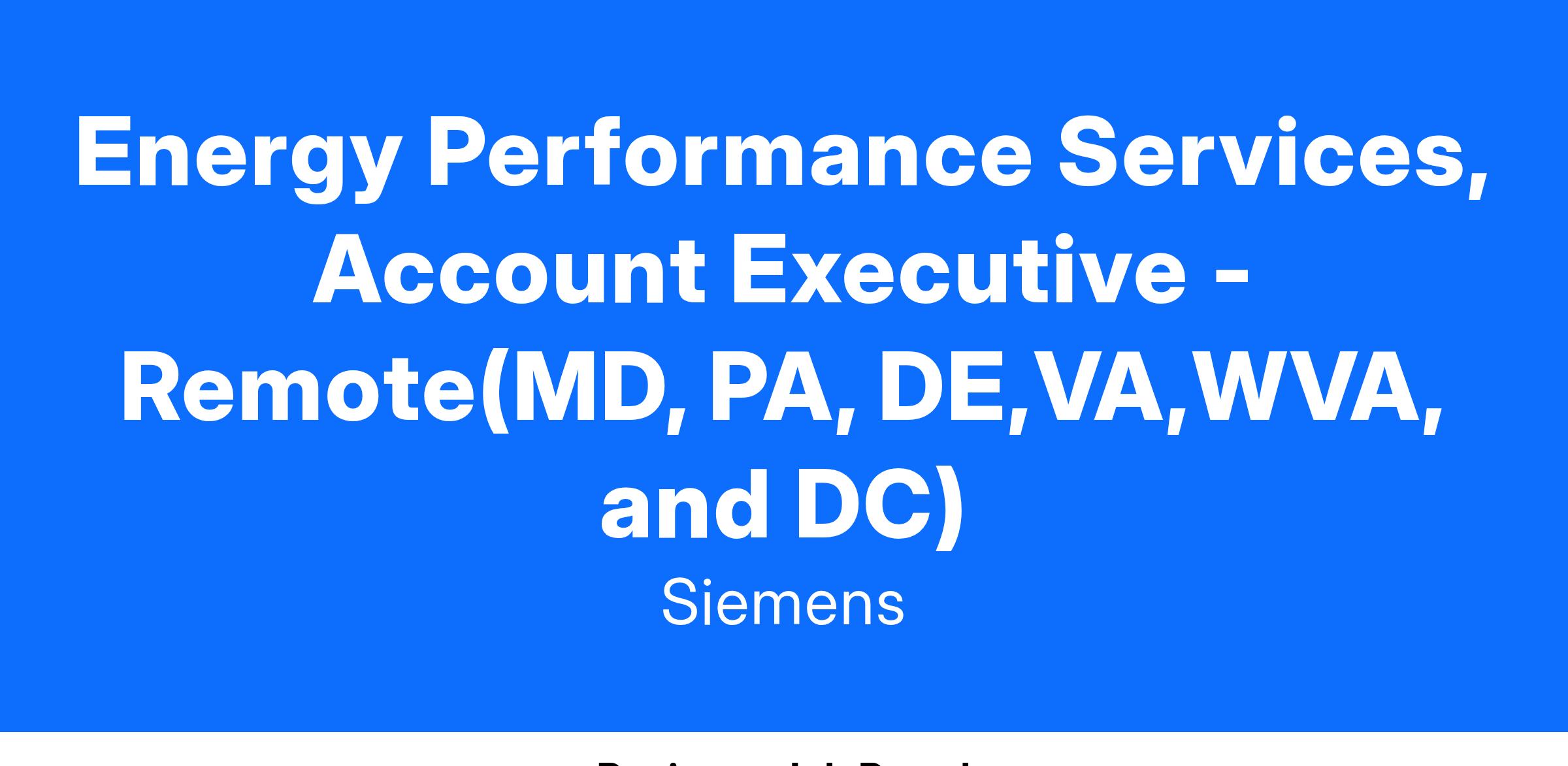 The Energy Performance Services Account Executive manages and grows the EPS business in the East Coast area. Identify market needs, develop sales strategies to address customer objectives, and develop solutions to help clients improve their facilities, operations, and profitability. The EPS sales team works across multiple Siemens divisions and other local Siemens branch offices to position Siemens as a preferred solutions provider for demand- and supply-side energy programs, including building retrofit, performance contracting, and Distributed Energy Systems (DES) projects.