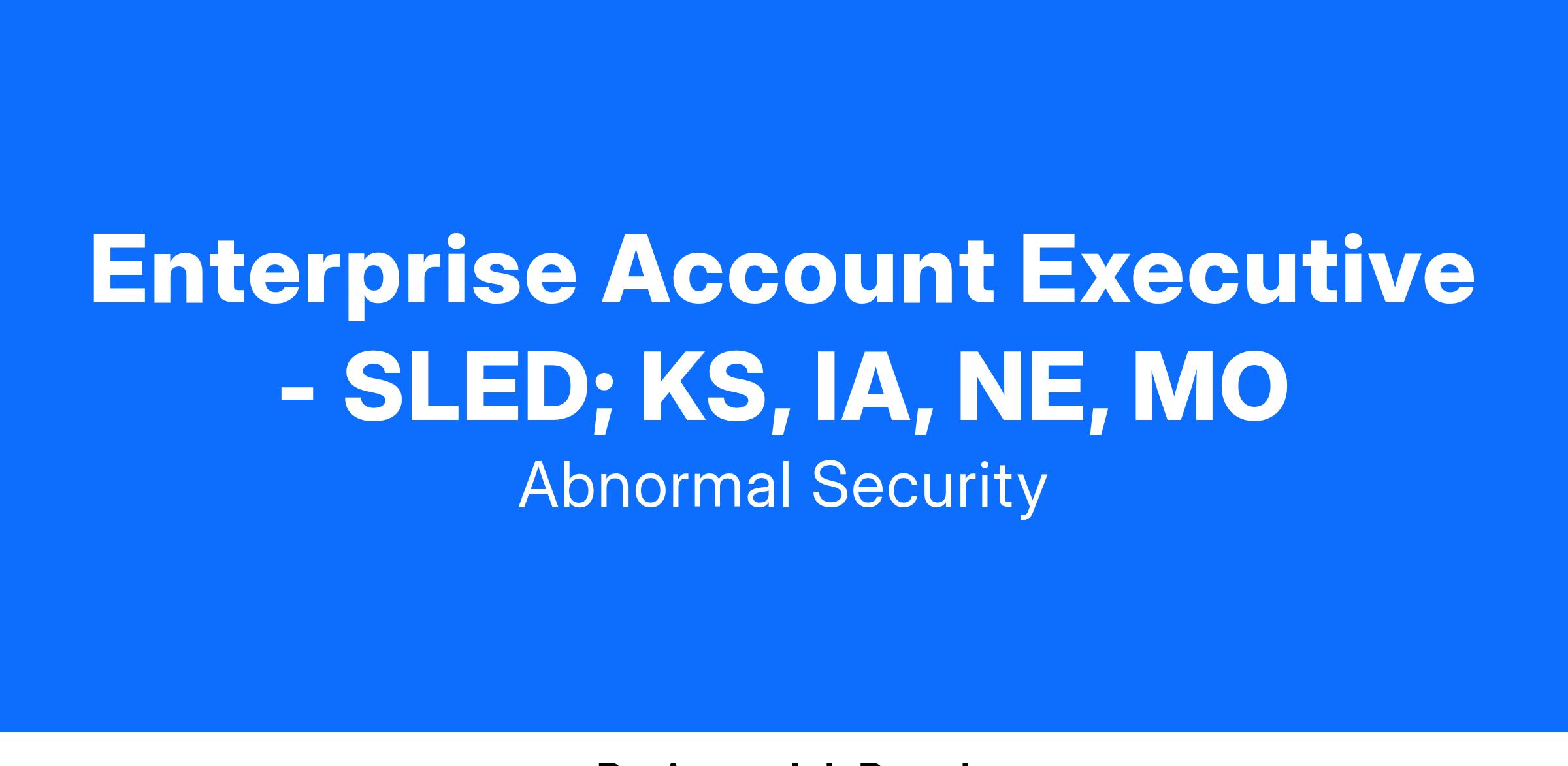 Abnormal Security is looking for an Enterprise SLED Account Executive to join our team. In this role, you will sell Abnormal Security Solutions to State/Local Government & K-12 Education (SLED) accounts (>2k mailbox organizations) in your defined territory. The ideal candidate will bring a hunter mentality, a passion for cybersecurity, and proven team-selling experience.Β