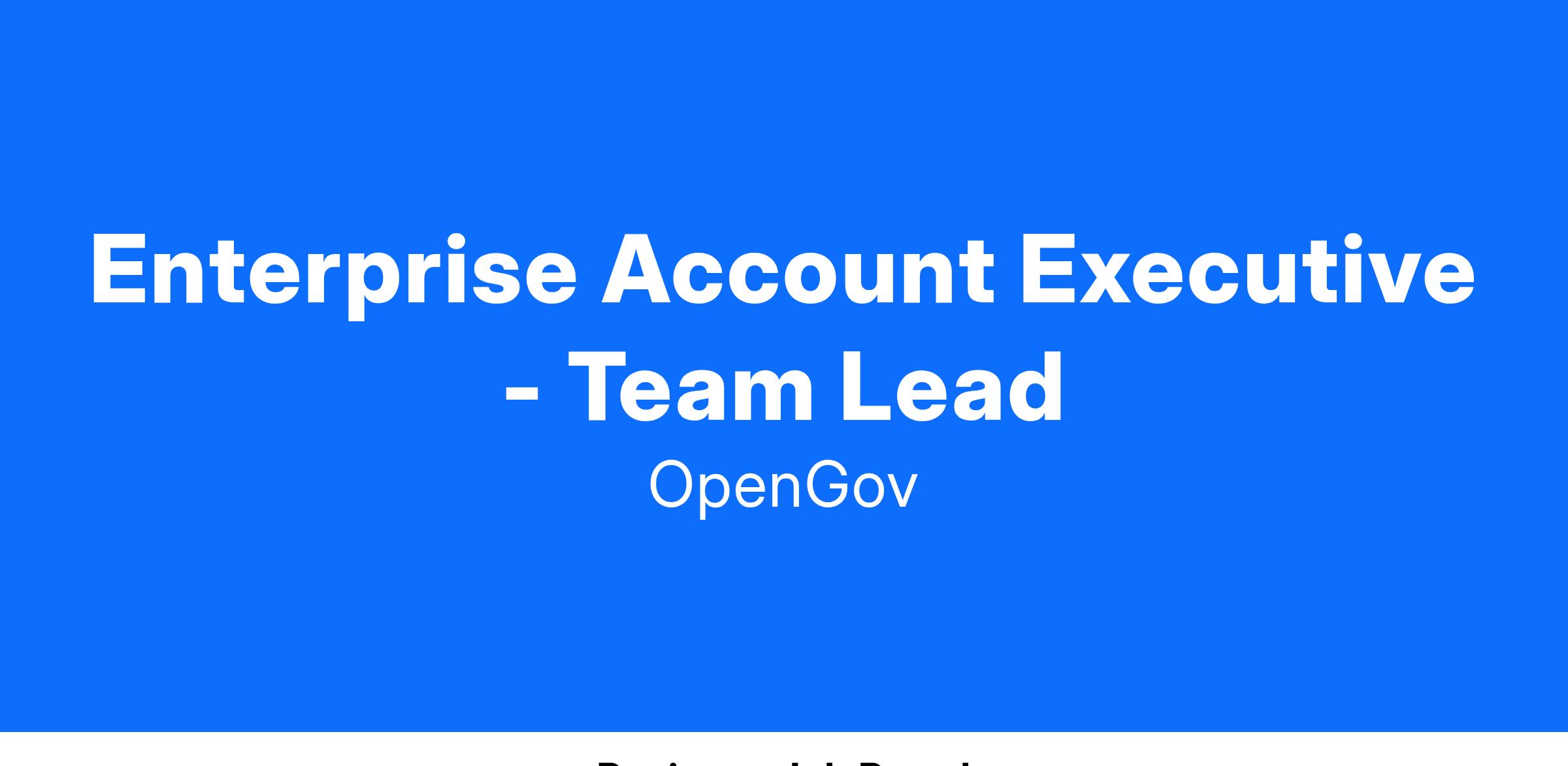 The Account Executive will lead OpenGov’s Enterprise and multi-suite opportunities sales efforts within their assigned territory, including territory planning, prospect identification, lead generation, sales calls, leading the sales cycle, proposals, and contract negotiation through deal closure. This individual will also work collaboratively with product-specific Account Executives to meet sales goals and deliver the highest standard of integrity, quality, and customer service to our customers. The Enterprise Team Leader will help drive viral growth strategies in their territory by being the primary territory partner across the organization interacting with team members such as SDRs and Marketing/Demand Generation.
