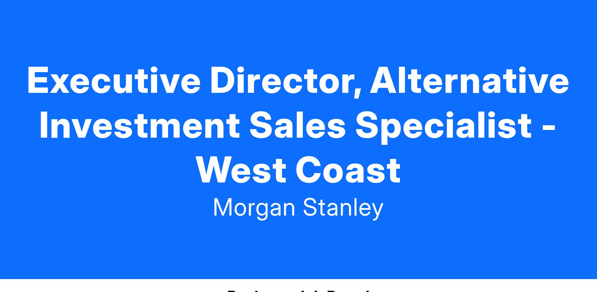 The MSIM Alternative Investments Distribution team is seeking an experienced, independent, self-motivated distribution professional to lead the MSIM Alternatives business development and distribution efforts in the West region. Acting as a true specialist, you will be responsible for explaining complex Alternative Investment strategies and concepts at a granular level to financial advisors across the full spectrum of alternative asset classes including private equity, private credit, private real estate / infrastructure, and hedge funds.