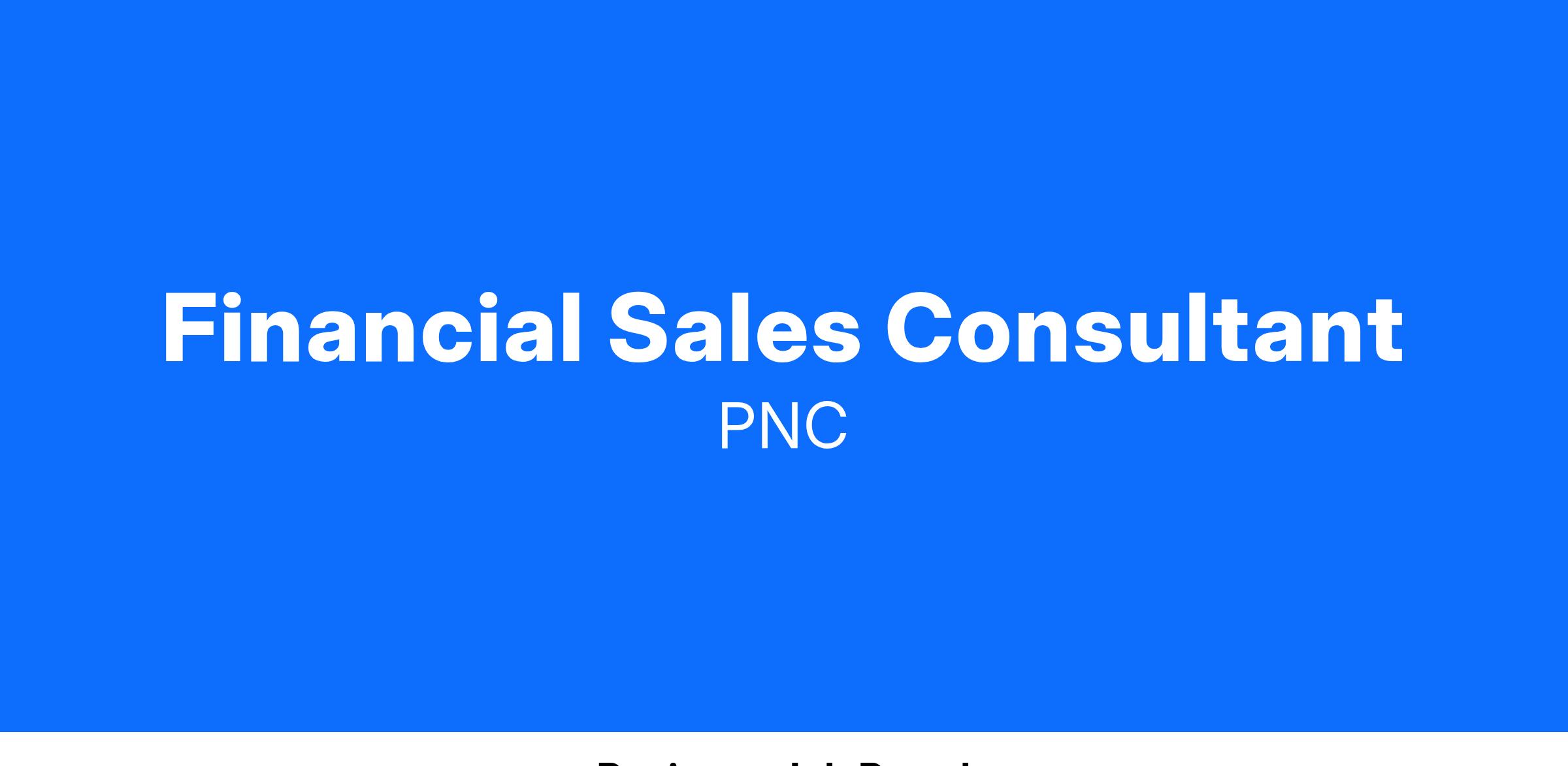 At PNC, our people are our greatest differentiator and competitive advantage in the markets we serve. We are all united in delivering the best experience for our customers. We work together each day to foster an inclusive workplace culture where all of our employees feel respected, valued and have an opportunity to contribute to the company’s success. As a Financial Sales Consultant, you will be within PNC's Organizational Financial Wellness organization. This position is primarily based in the Northern Virginia & Washington, D.C. markets. Responsibilities require time in the office or in the field on a regular basis. Some responsibilities may be performed remotely, at manager’s discretion.