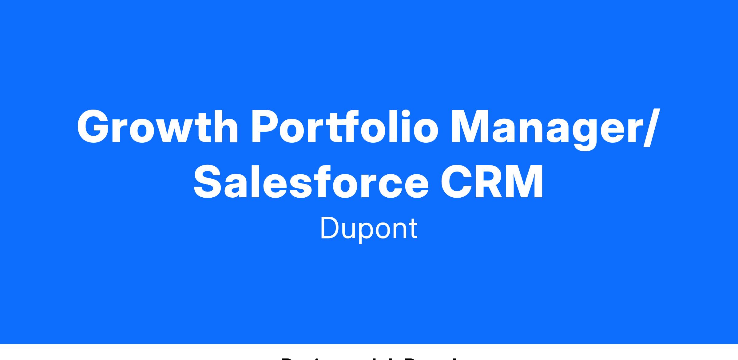 Reporting to the Business Enablement Leader in the DuPont Water Solutions business, the Growth Portfolio Manager will be the business process owner for both our Salesforce.com platform and our innovation process. This role will lead implementation of commercial excellence operations across our sales organization - driving optimal Salesforce utilization, best-in-class B2B customer relationship management, and connecting people, processes, and technology seamlessly. This role will also lead our quarterly growth board process and monitor innovation portfolio performance through metrics tracking and analytical tools. Across both growth platforms the ideal candidate will develop insights to drive change with a senior group of stakeholders.