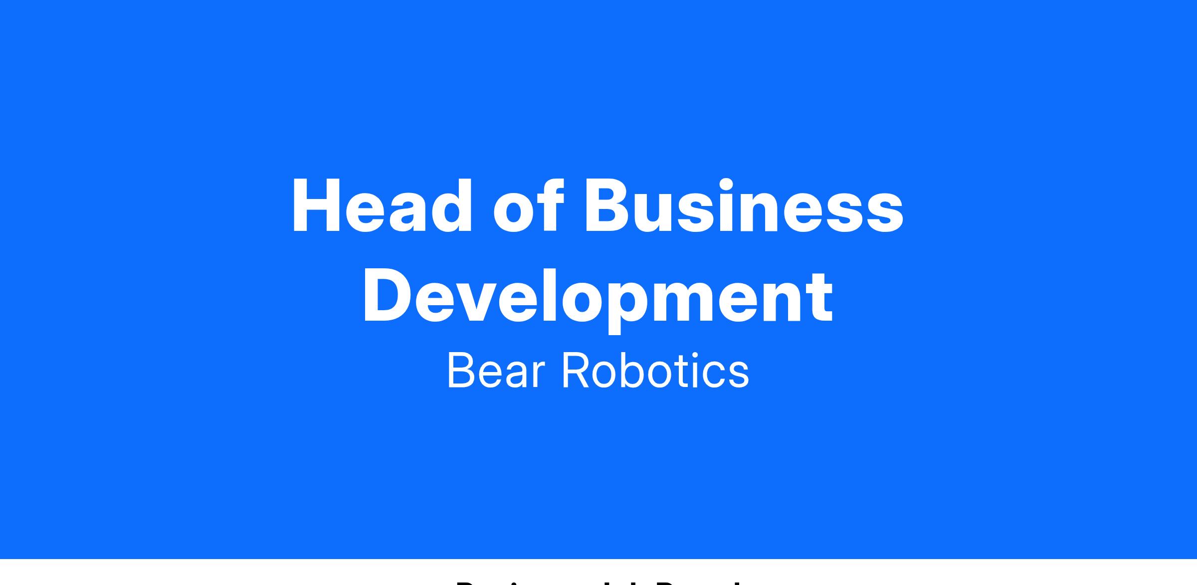 Bear Robotics is a leading industry manufacturer of AI-driven autonomous robots. As the Head of Business Development, you will play a pivotal role in shaping and executing Bear Robotics’ growth strategy. This person will have the opportunity to build out the Business Development Department. You will be responsible for identifying and securing new business opportunities, building strategic partnerships, and driving revenue growth. This position requires a dynamic leader with a proven track record in business development within the robotics/technology or hospitality industry. This position will require you to be in the Redwood City office during core business 5 days a week.